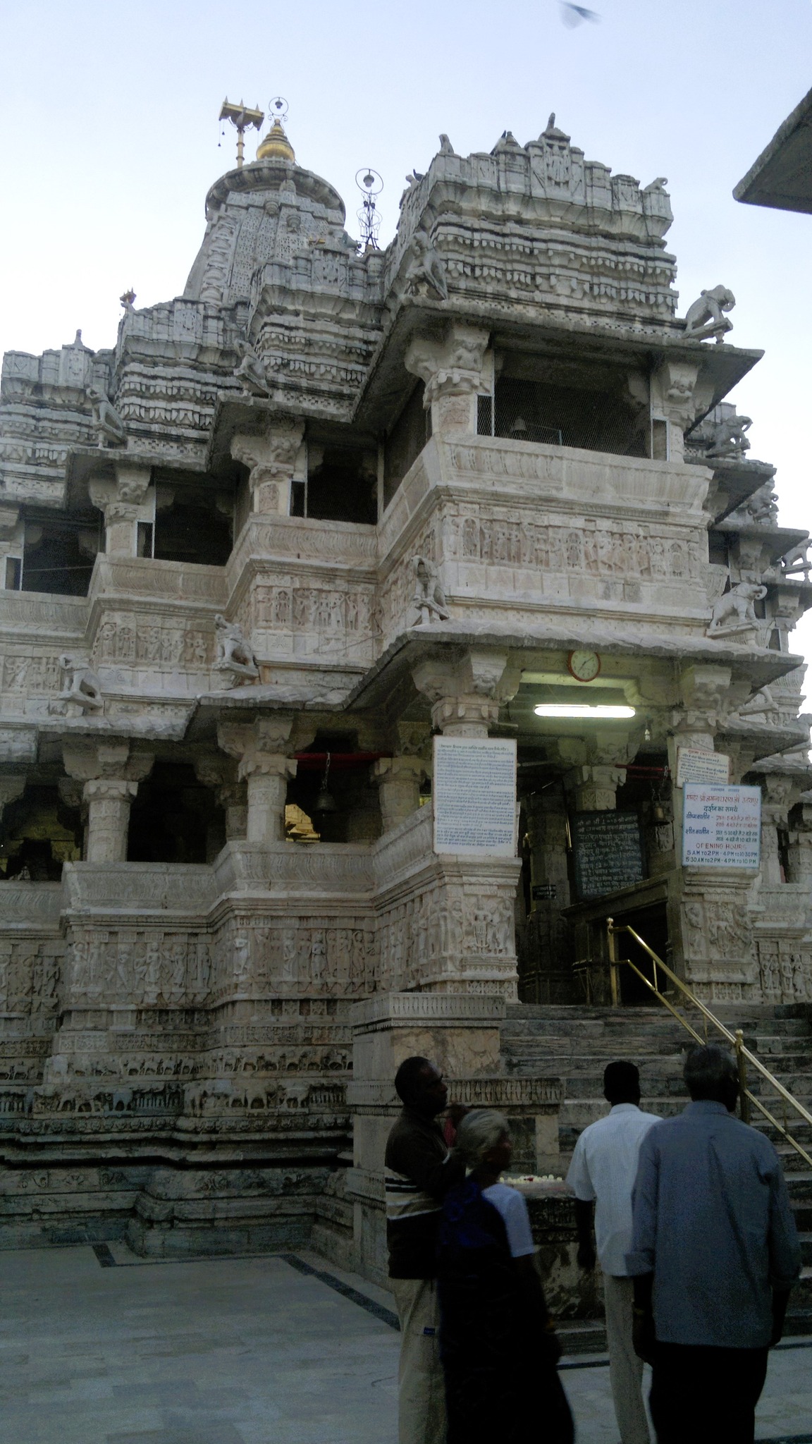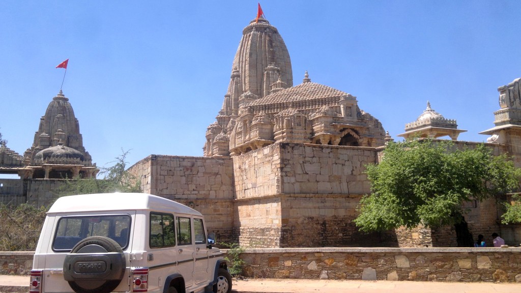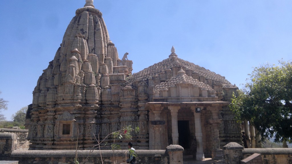 Soon, the autorickshaw was clattering up the winding road, passing through multiple stone arched gates, called pols, one after another. At long last, passing through a cluster of normal but old looking houses, looking very similar to a village, we came on to an open clearing on flat around where the ticket counter stood. Buying my ticket, we rode further on the road towards the south until we reached a crossroads with multiple structures occupying the space on all sides of the crossroads. A palace stood right beside me, which I learnt was Kumbha’s palace. A cluster of marble built Jain temples stood on my left side, while two stone-built Hindu temples stood diagonally opposite side.