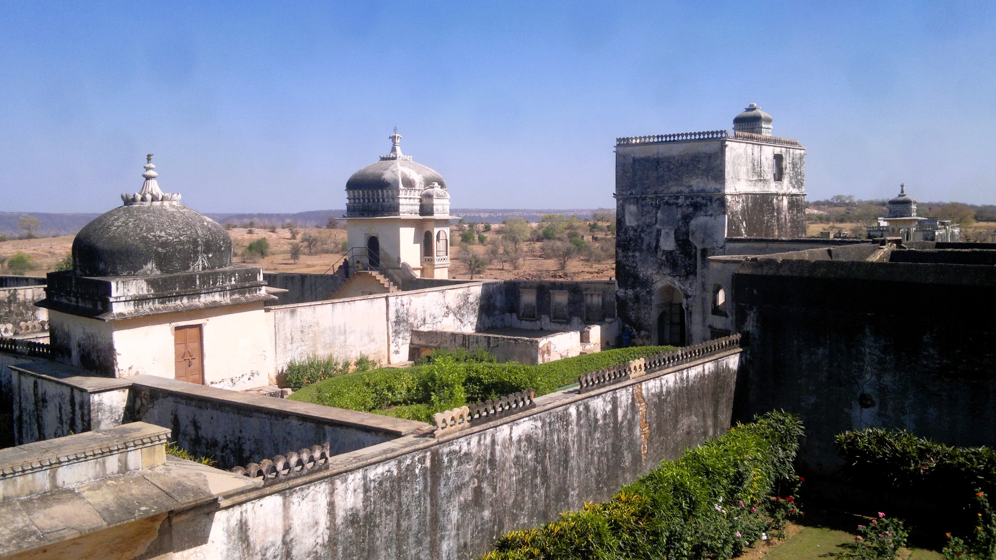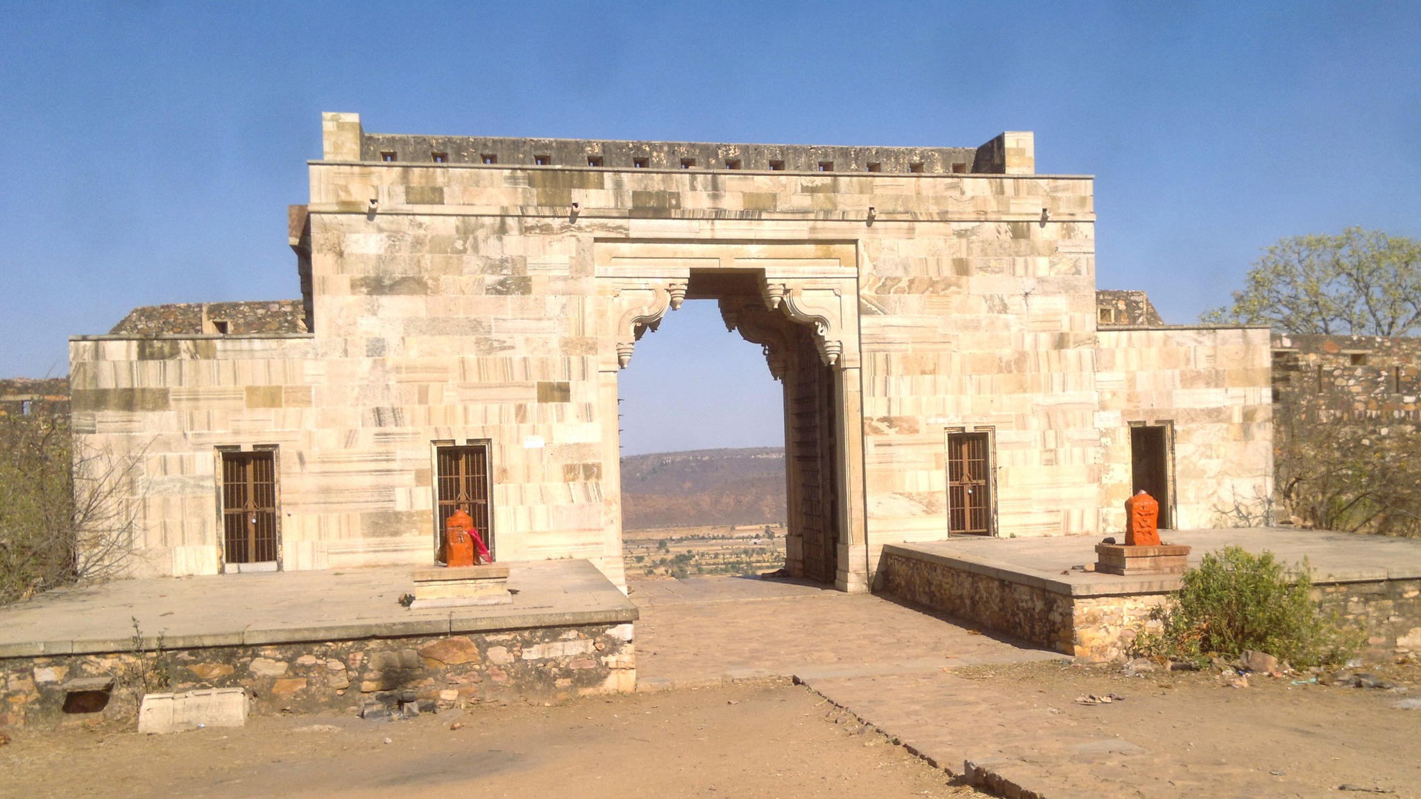 Pushing further south, the road curved around a water tank with a deer park occupying the outer side, and turned 180 degrees towards the north, with thin jungle flanking on both sides. Now heading a couple of hundred metres, we came upon the main gate of the fort, which overlooked the sparsely inhabited valley below. A stony curving path led from the valley below to the gate, with a low flat hill stretching from one end to another in the background, while ramparts streamed along the edge of hill from both sides of the gate. Moving further to the north, we came upon a cluster of Jain temples, amidst which stood another tower, looking like a prototype of the Vijaya Stambha, called Kirti Stambha, which is dedicated to Adinatha and was built in the 12th century.