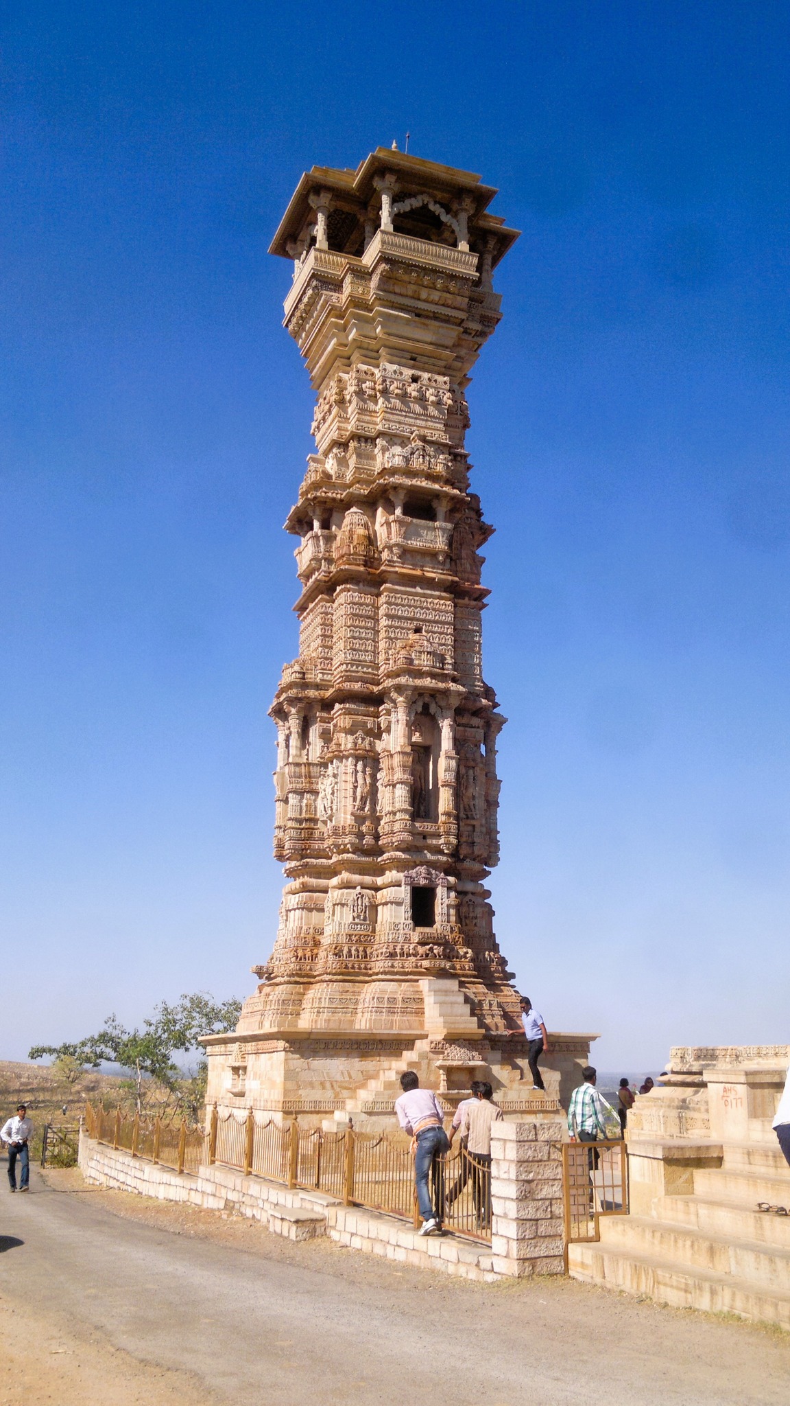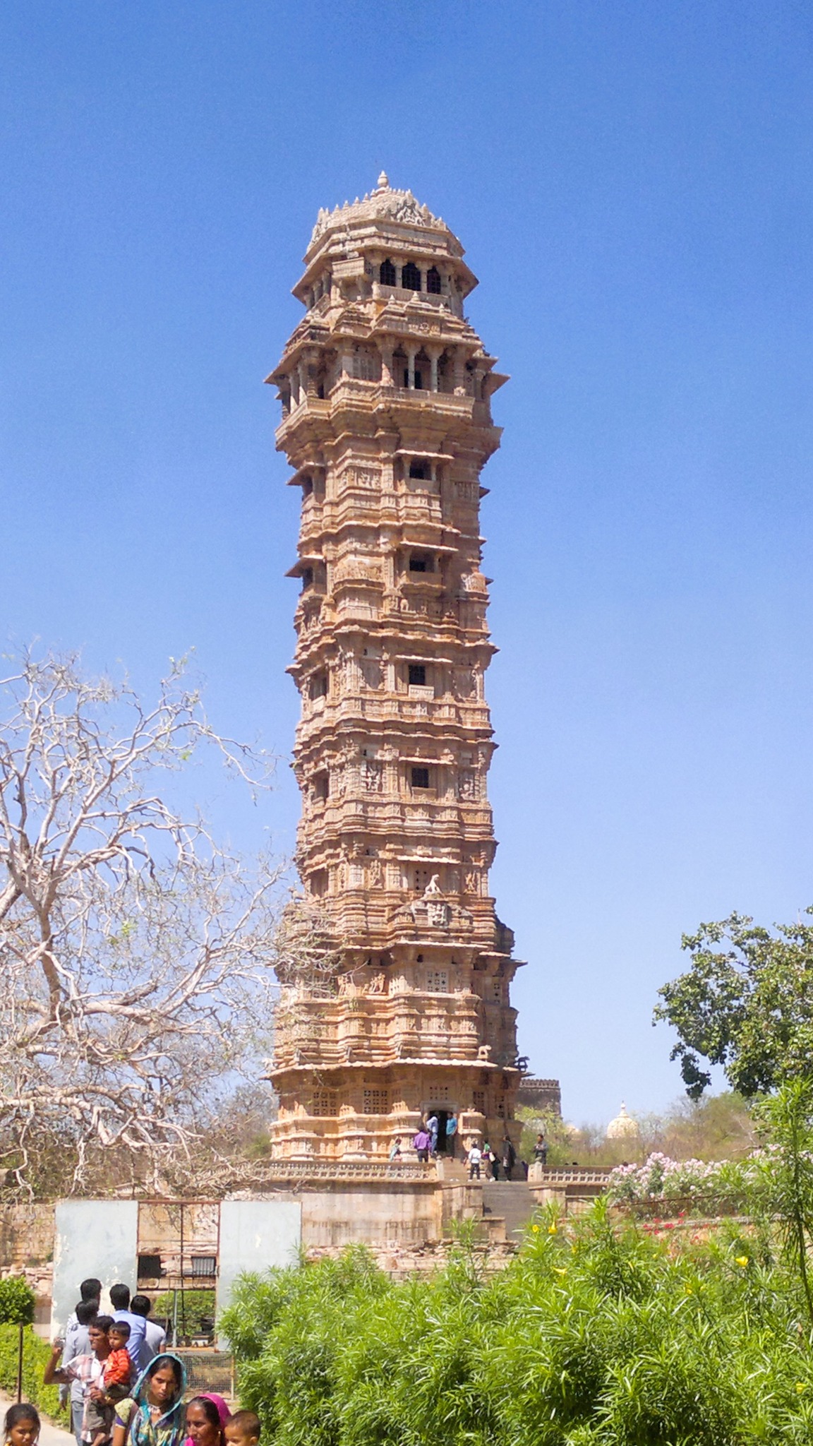 I got down at the crossroads to first see Kumbha’s palace, and then proceeded a little to the south to see the aforementioned two temples, namely, Kumbhashyam temple and Meera temple, the latter being a Krishna temple where Meera Bai from Merta who had married into Chittor, immersed herself in devotion to Krishna. Back outside the temple complex, as I turned my gaze a little to the south-west, I saw that right in front of me at a distance stood a tower that looked eerily similar to the one I remembered from the sketch from the magazine – it was indeed the Vijaya Stambha. Without further ado, I beckoned my guide to head straight to the Vijaya Stambha.