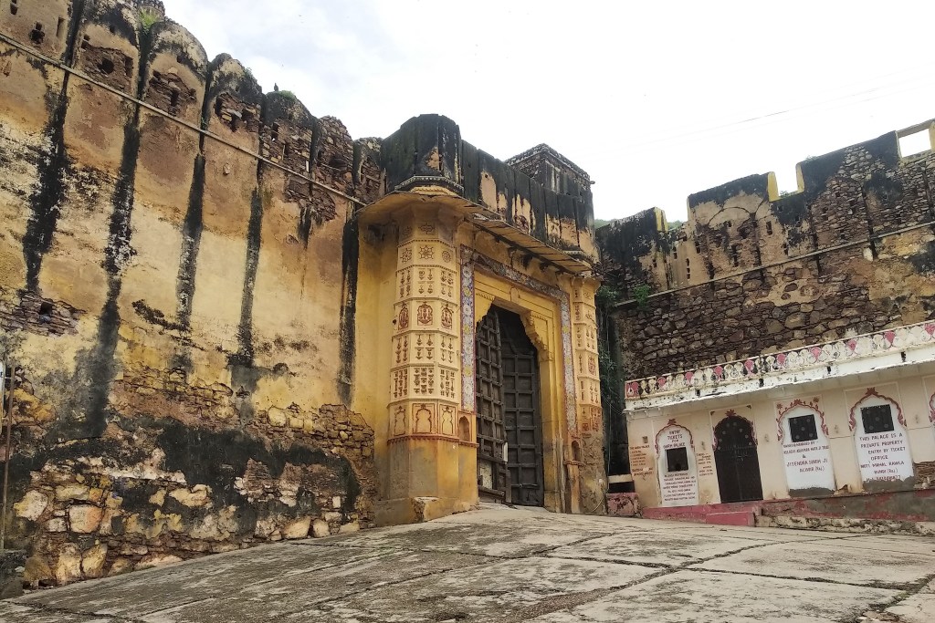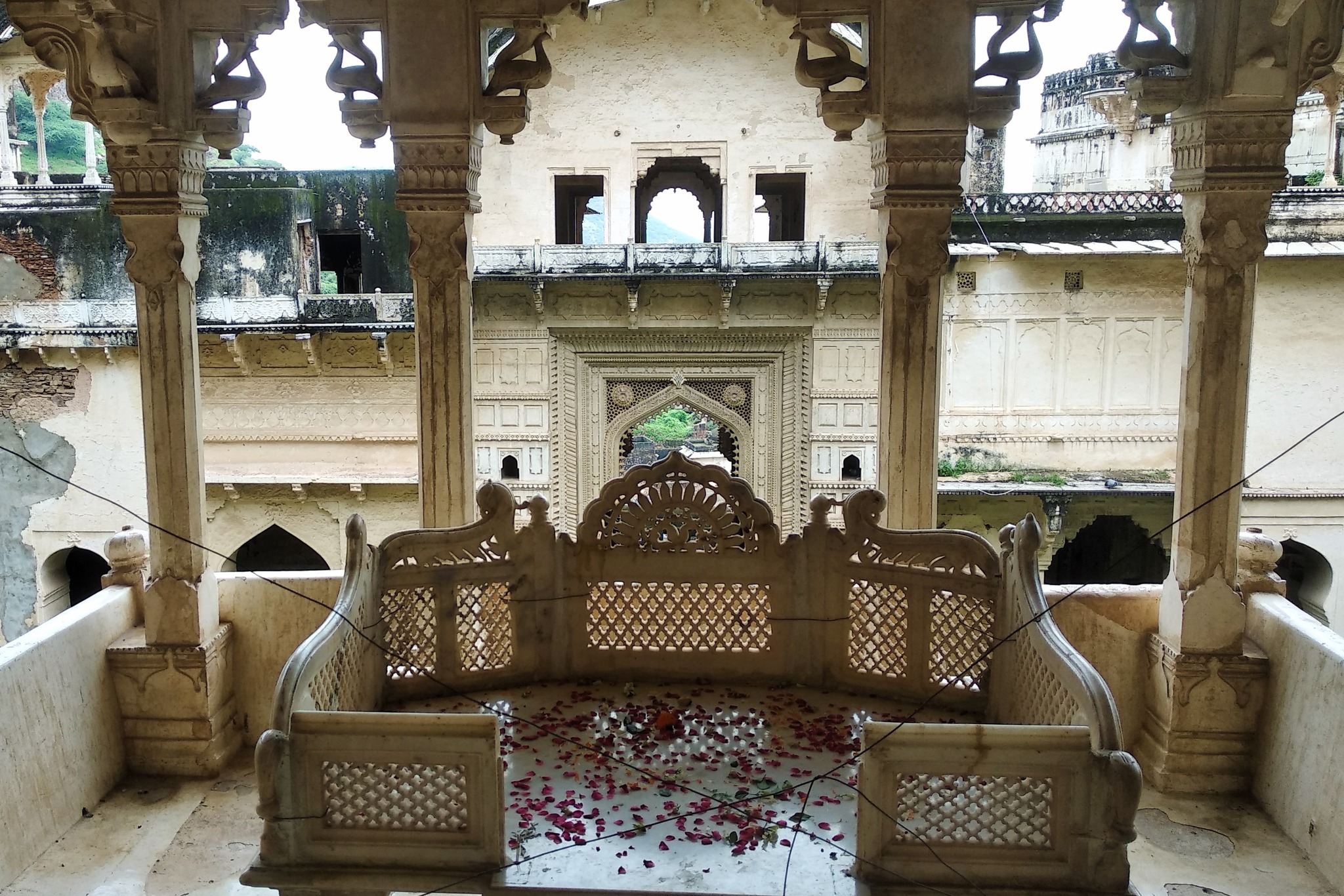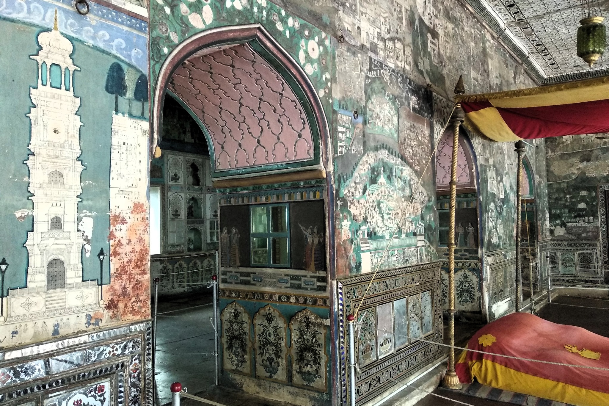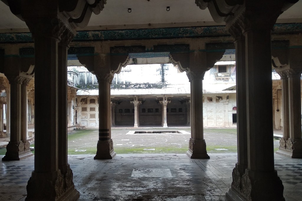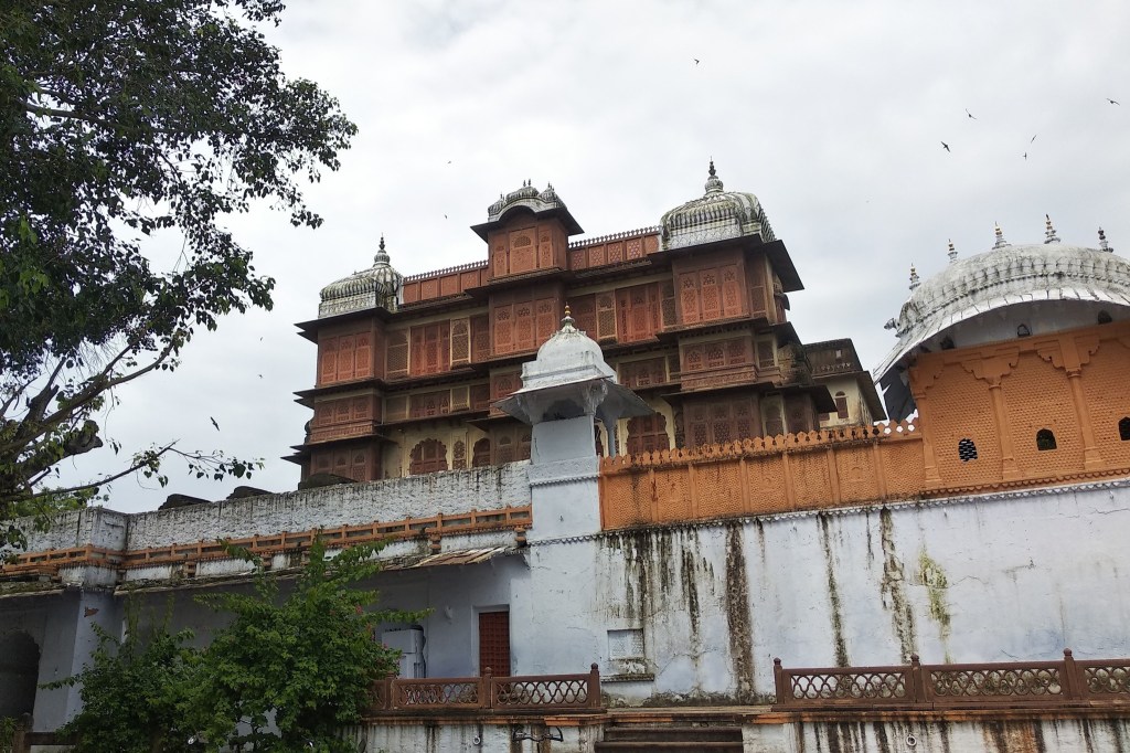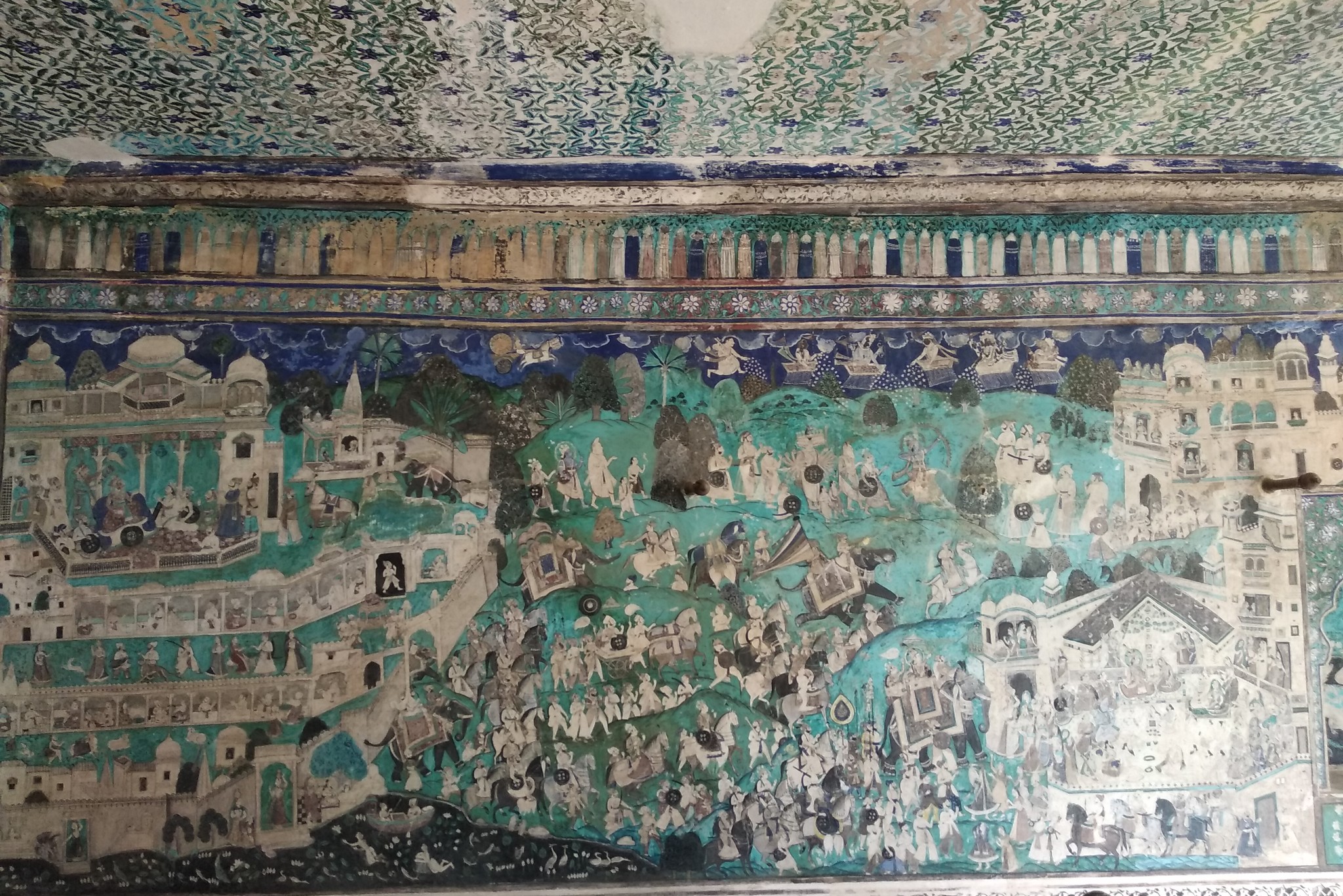 Inside the Garh Palace, we explored multiple storeys of the palace, climbing up the labyrinthine stairs, walked through the many halls and rooms, and reached the roof of the Badal Mahal which owing to it being at one of the highest points of the palace, afforded a panoramic view of the village and the pond nestled in the hills. We then walked to an adjacent structure, called Chitrasala, which houses numerous murals and frescoes.
