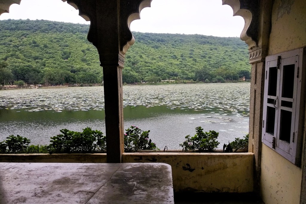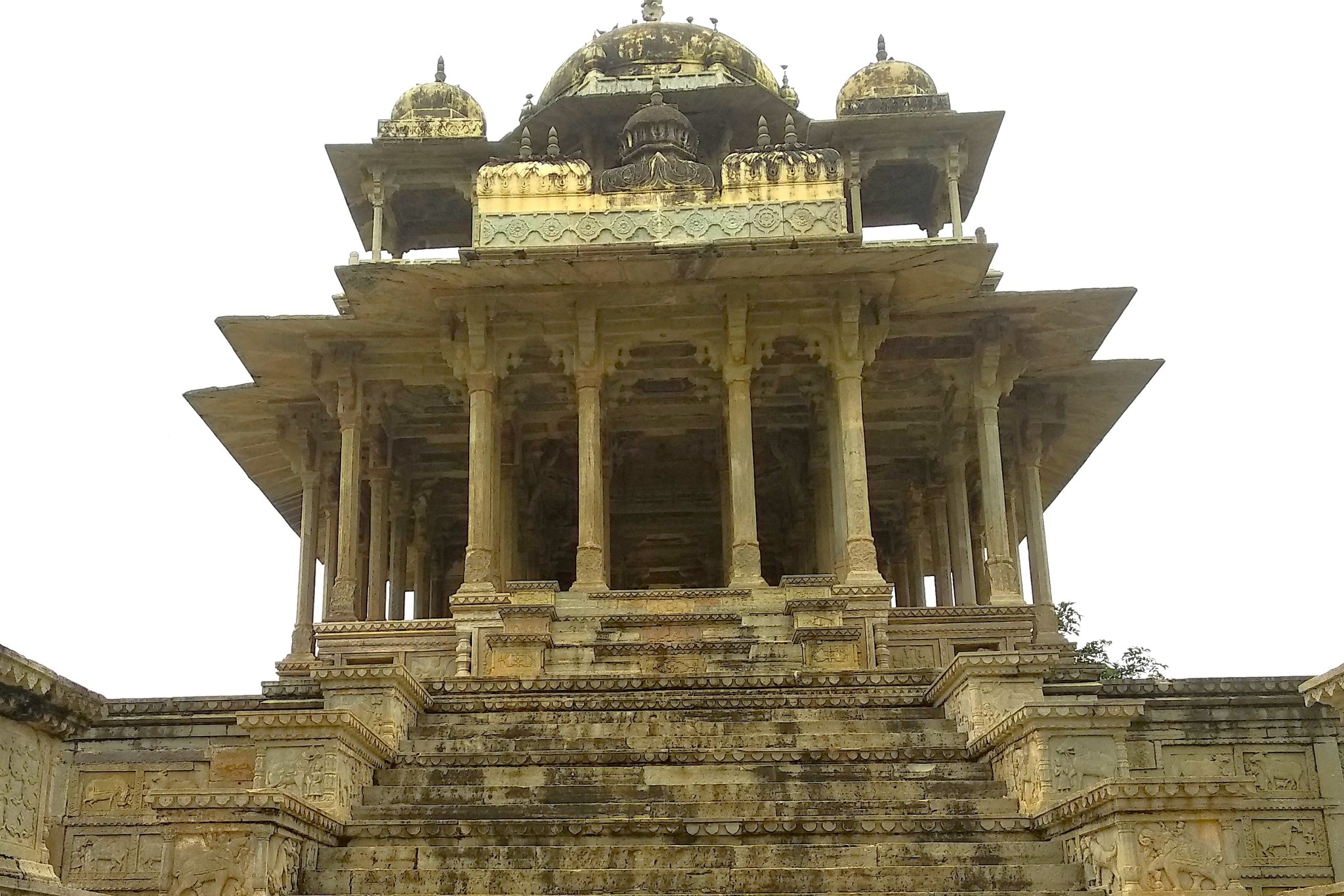 A little later, crossing the mighty Chambal river, and riding for some time, we passed through a tunnel in the Aravallis, and then climbed up a pass in the hills, before we saw a most fascinating sight of a yellow-coloured multi-storeyed structure with balconies, windows and domes etched at a height against the hillside, separated from the road by a large pond with a cenotaph in the centre.