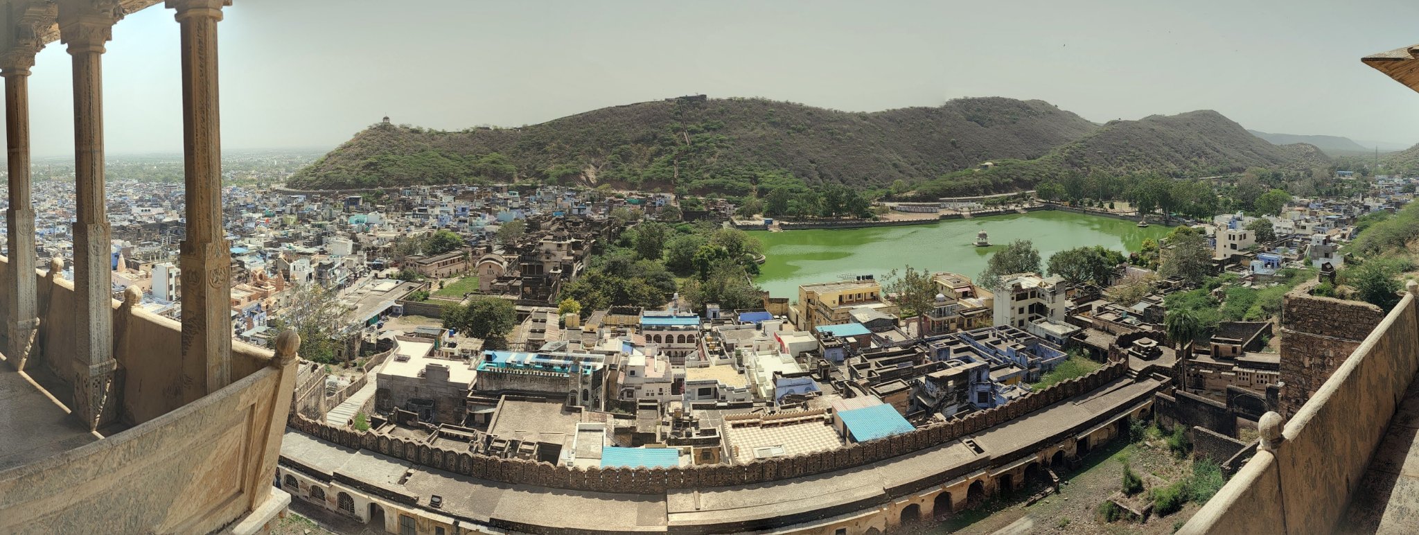 A quaint town nestled in the Aravallis, with an imposing hill-side palace overlooking a lake.