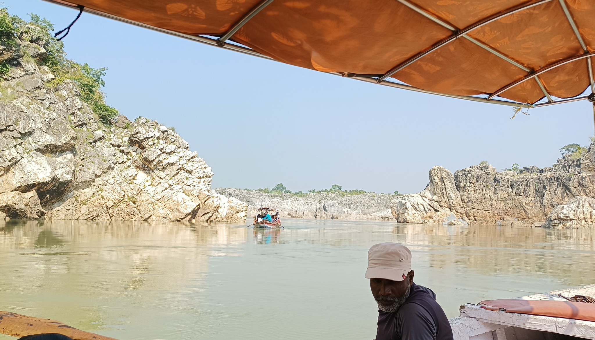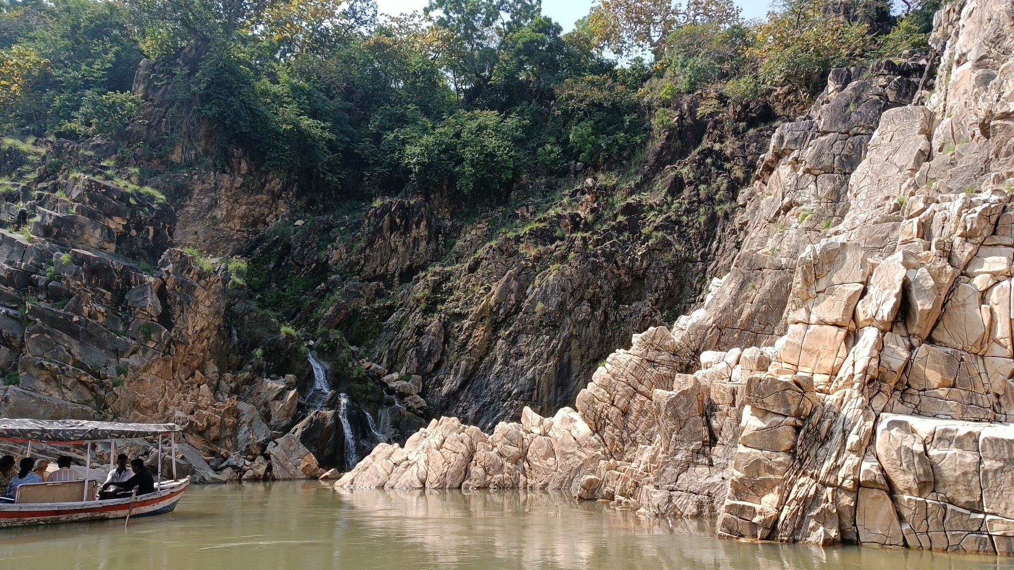 Marble Rocks in the Narmada river at Bedaghat, in a ravine formed in the hills replete with marble stone