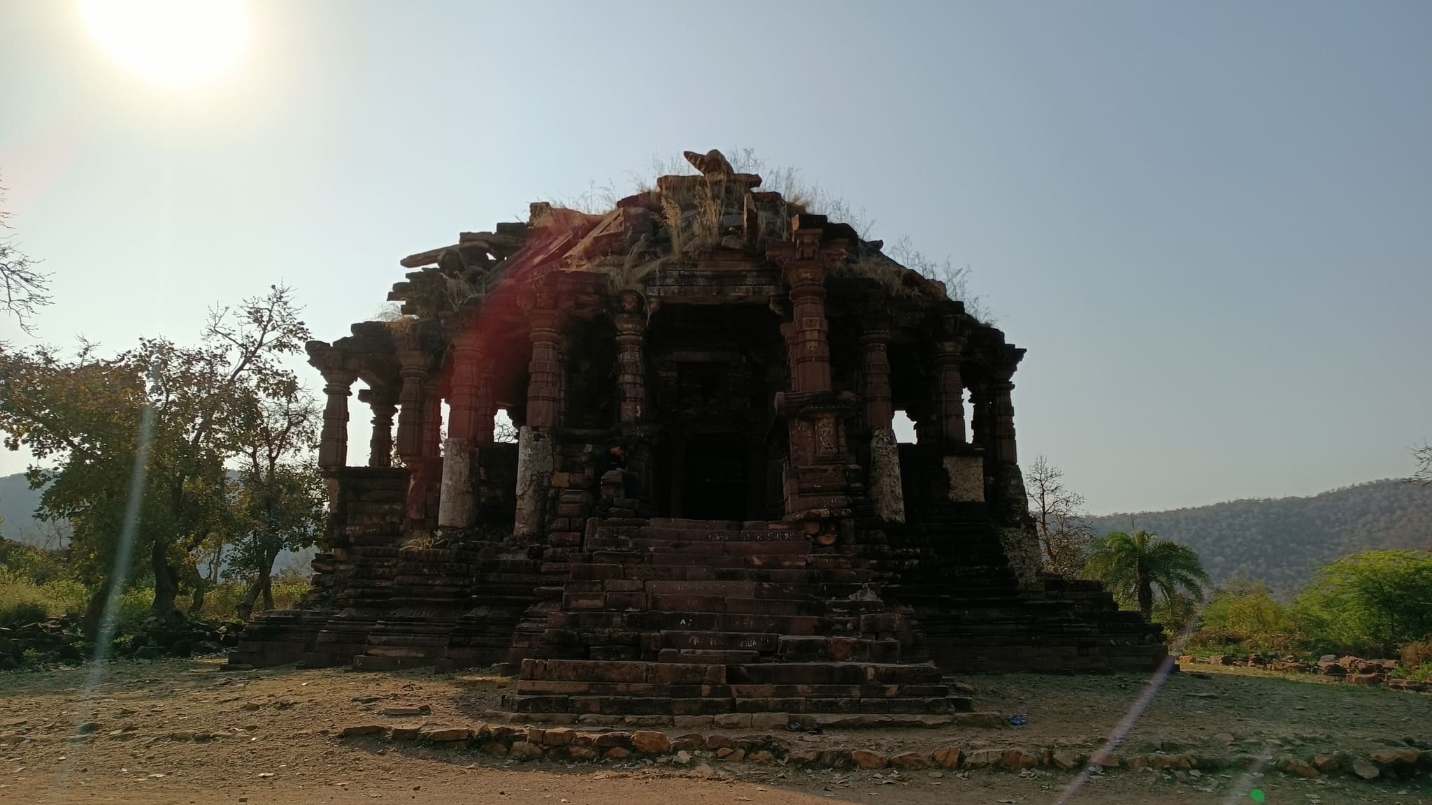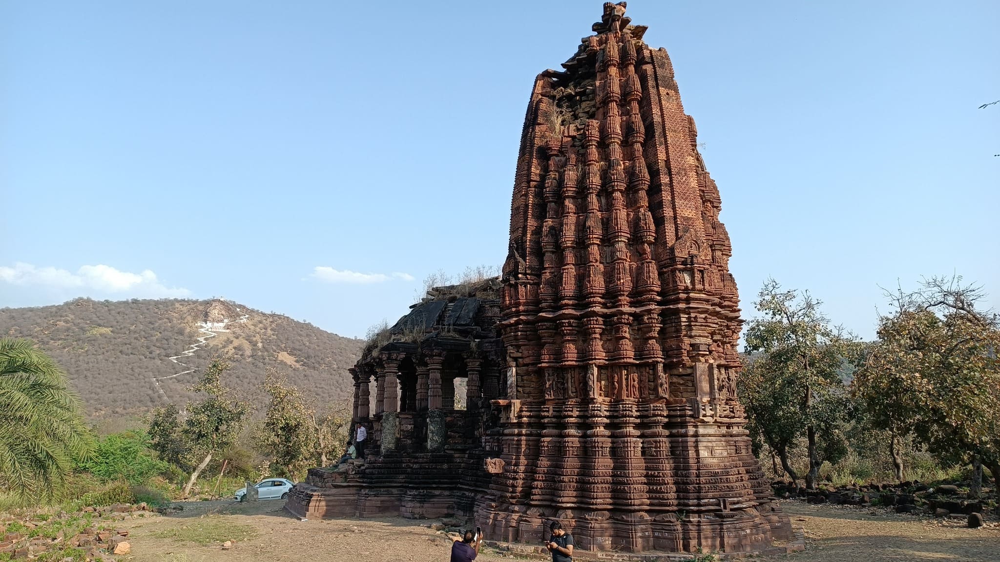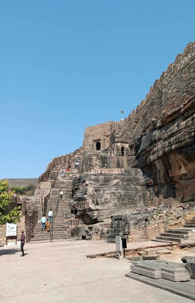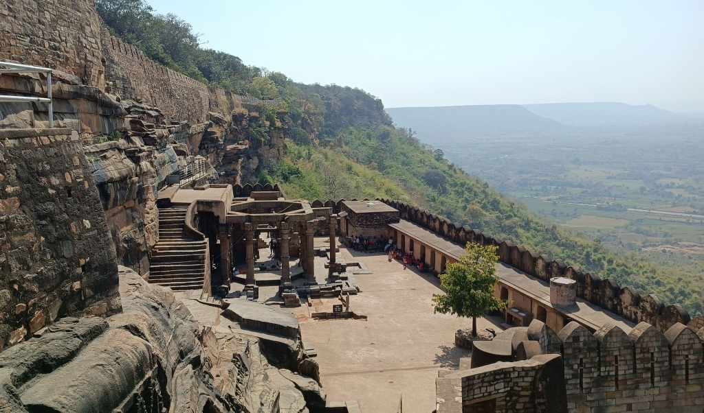 The fort sits on a flat-top hill, sprawling across a vast area replete with forest, ponds, and palaces. However, the most remarkable of the monuments is a temple formed out of a cave in the hillside, with the entrance embellished with a ruined pillared stone structure. The stone steps leading down to the temple are adorned with figures and caves carved into the rocky hillside that immediately transport one into the realm of perilous treasure hunts portrayed in an Indiana Jones adventure.