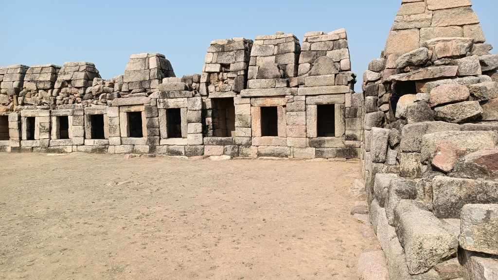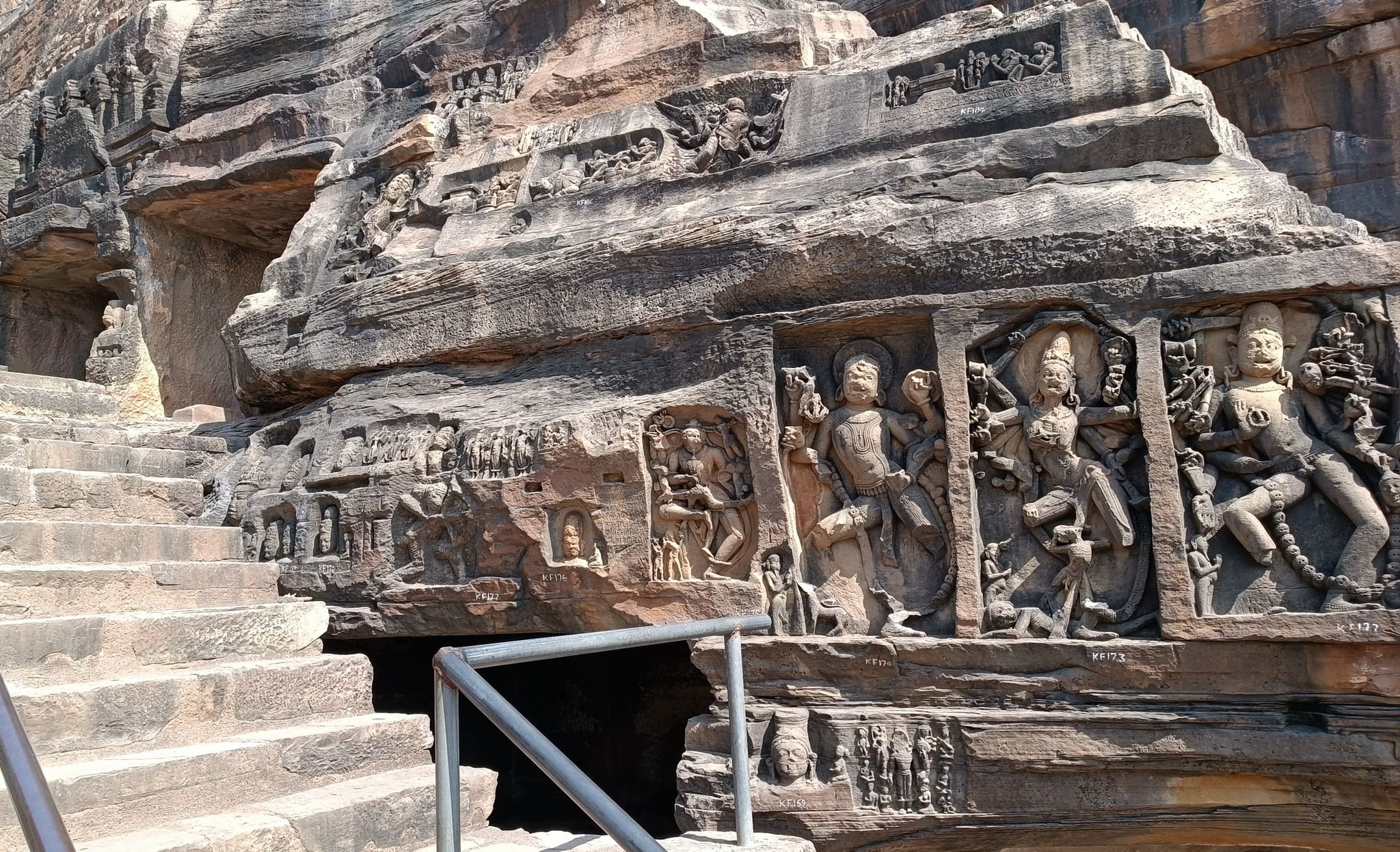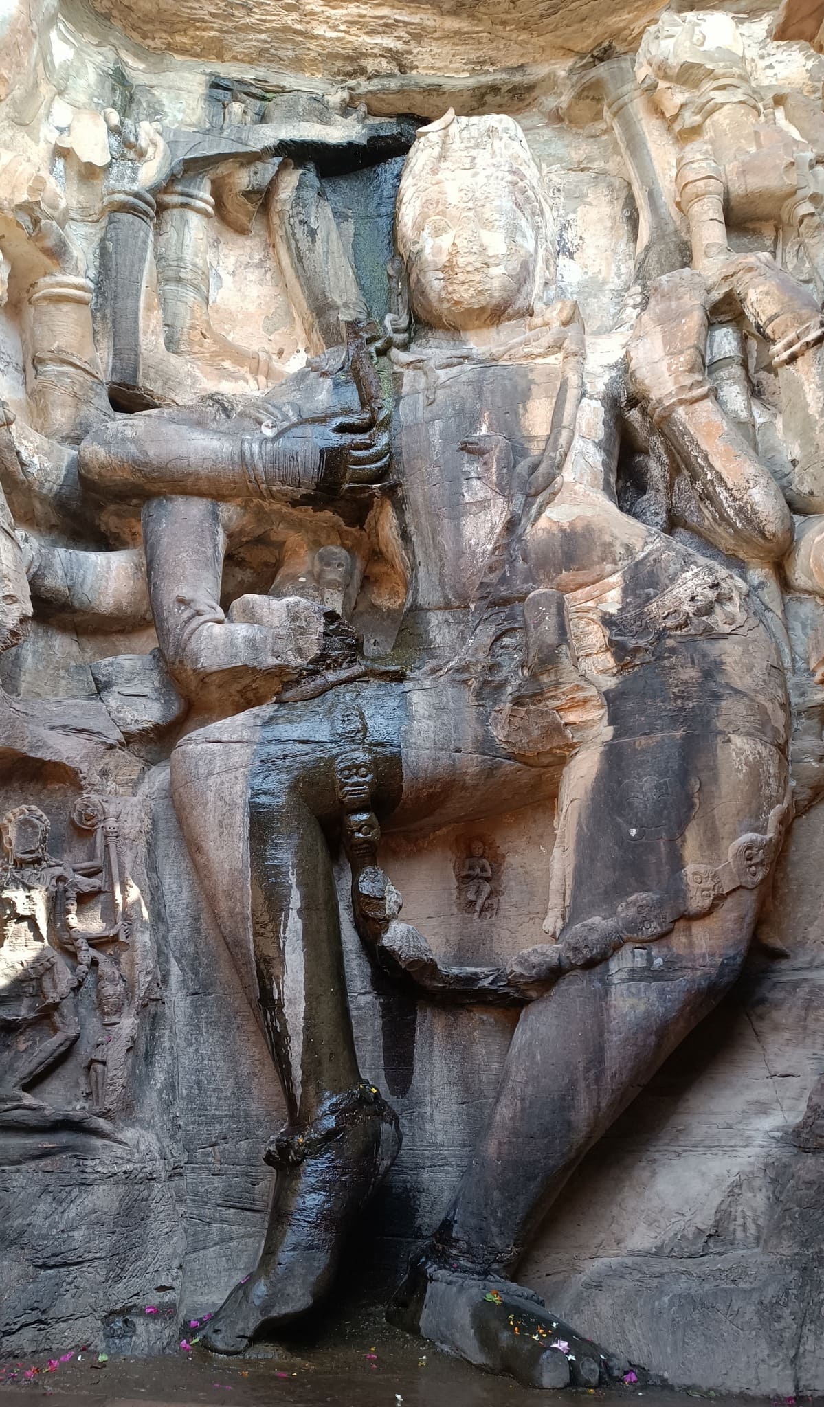 The fort sits on a flat-top hill, sprawling across a vast area replete with forest, ponds, and palaces. However, the most remarkable of the monuments is a temple formed out of a cave in the hillside, with the entrance embellished with a ruined pillared stone structure. The stone steps leading down to the temple are adorned with figures and caves carved into the rocky hillside that immediately transport one into the realm of perilous treasure hunts portrayed in an Indiana Jones adventure.