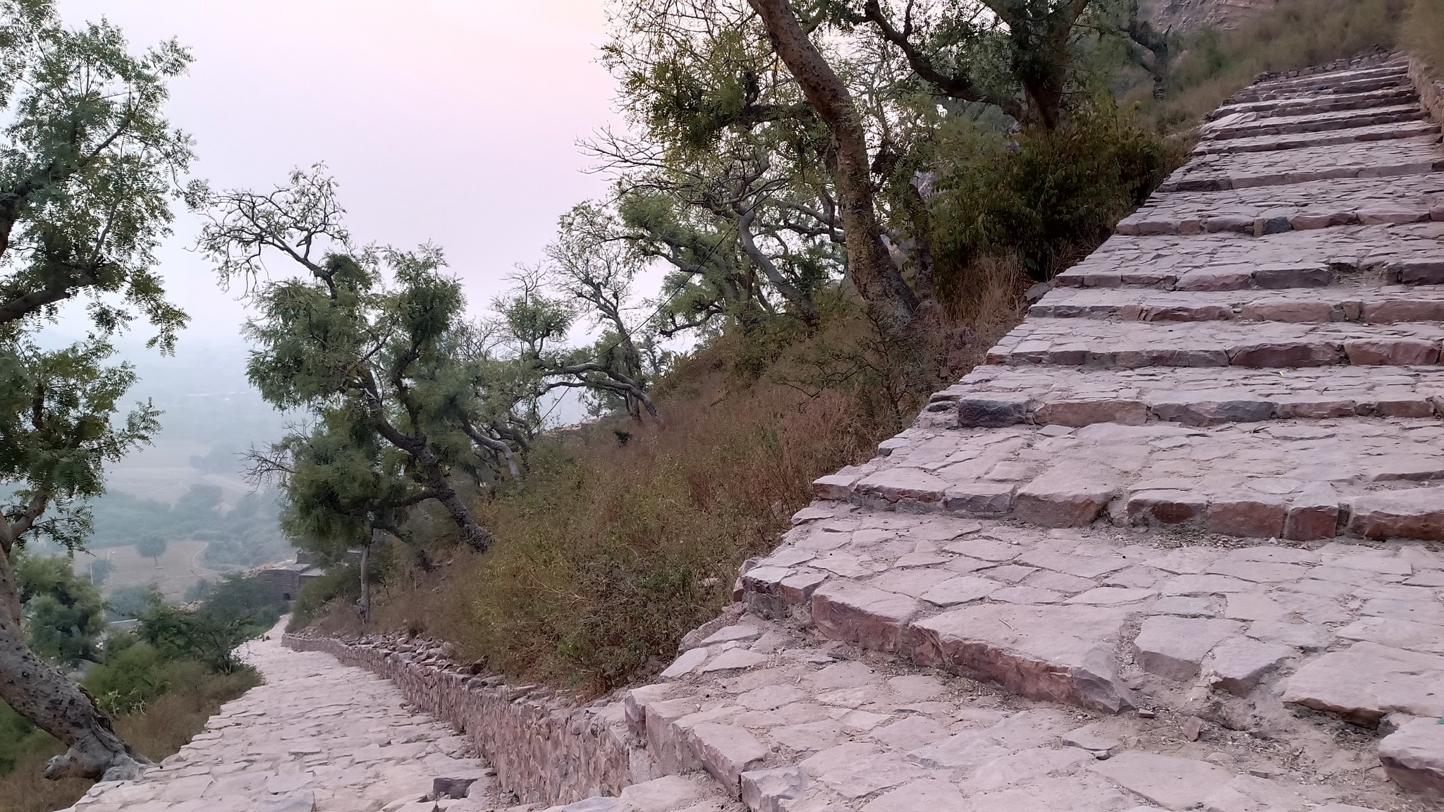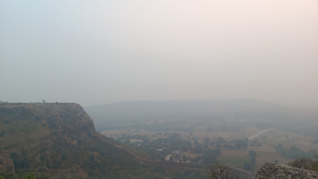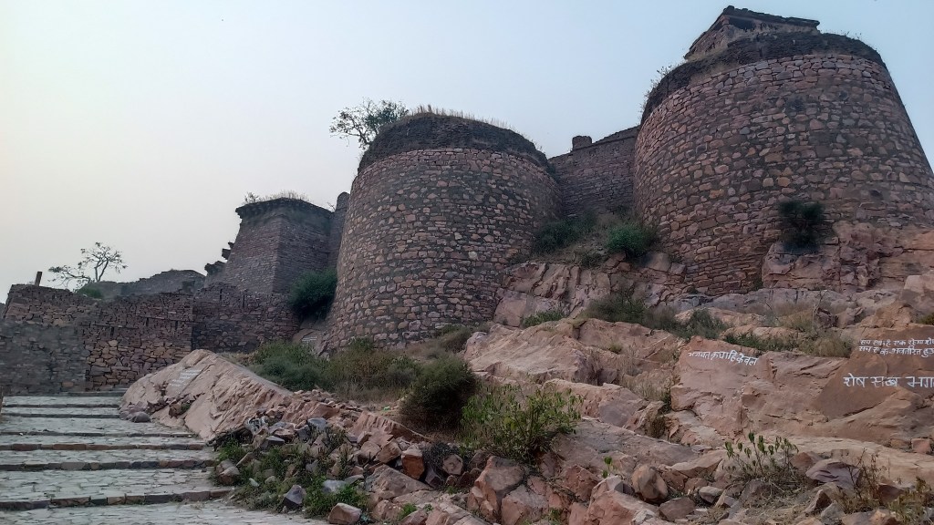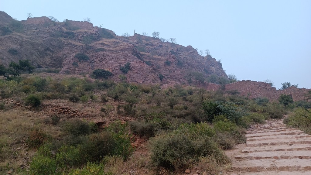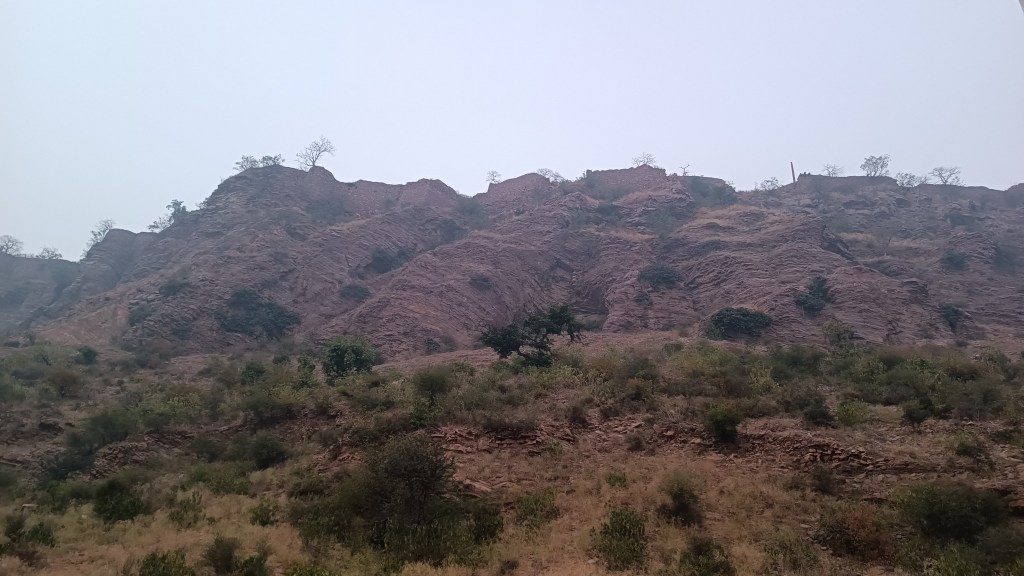 Somehow, circumstances lead me into situations where I land up in remote places on the verge of sundown. This time, it was at the base of a high cliff atop which sat the Bayana fort, with fortification walls stretching for miles and miles. I learned about Bayana Fort only a few months ago from a book called ‘Forts of Rajasthan’, and had been itching to set foot on it since. It was quarter to five on this mid-November evening when I finally arrived at my destination, having driven for an eternity, having been slowed down by narrow winding roads, interrupted by a political rally, and rocked by an undulating last-mile dirt road.