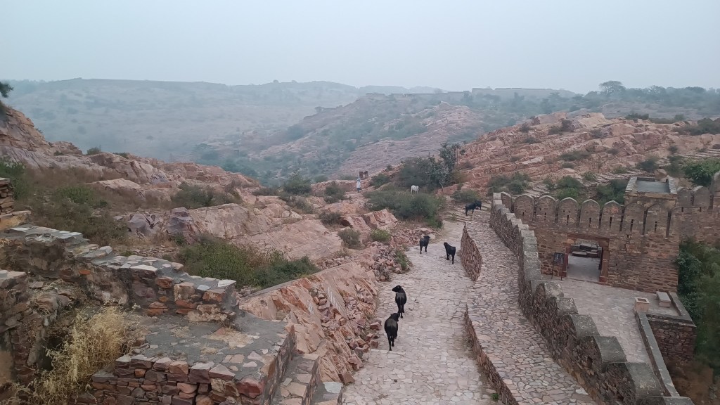 With darkness fast approaching, as I was descending down the stairs, I came face-to-face again with a long line of cows and buffaloes, making their way up, who simply refused to budge and let me pass. The stand-off continued for 10 minutes with me perched atop a ledge…till a calf, of all the bovines out there, decided to take the bull by its horns (pun intended) and took a few steps forward; the adults followed. I heaved a sigh of relief as the last one passed me by. With the sun already down, I hiked back, admiring the loftiness of the fort walls and the lushness of the landscape awash in the waning twilight while peacocks went about their evening walks.