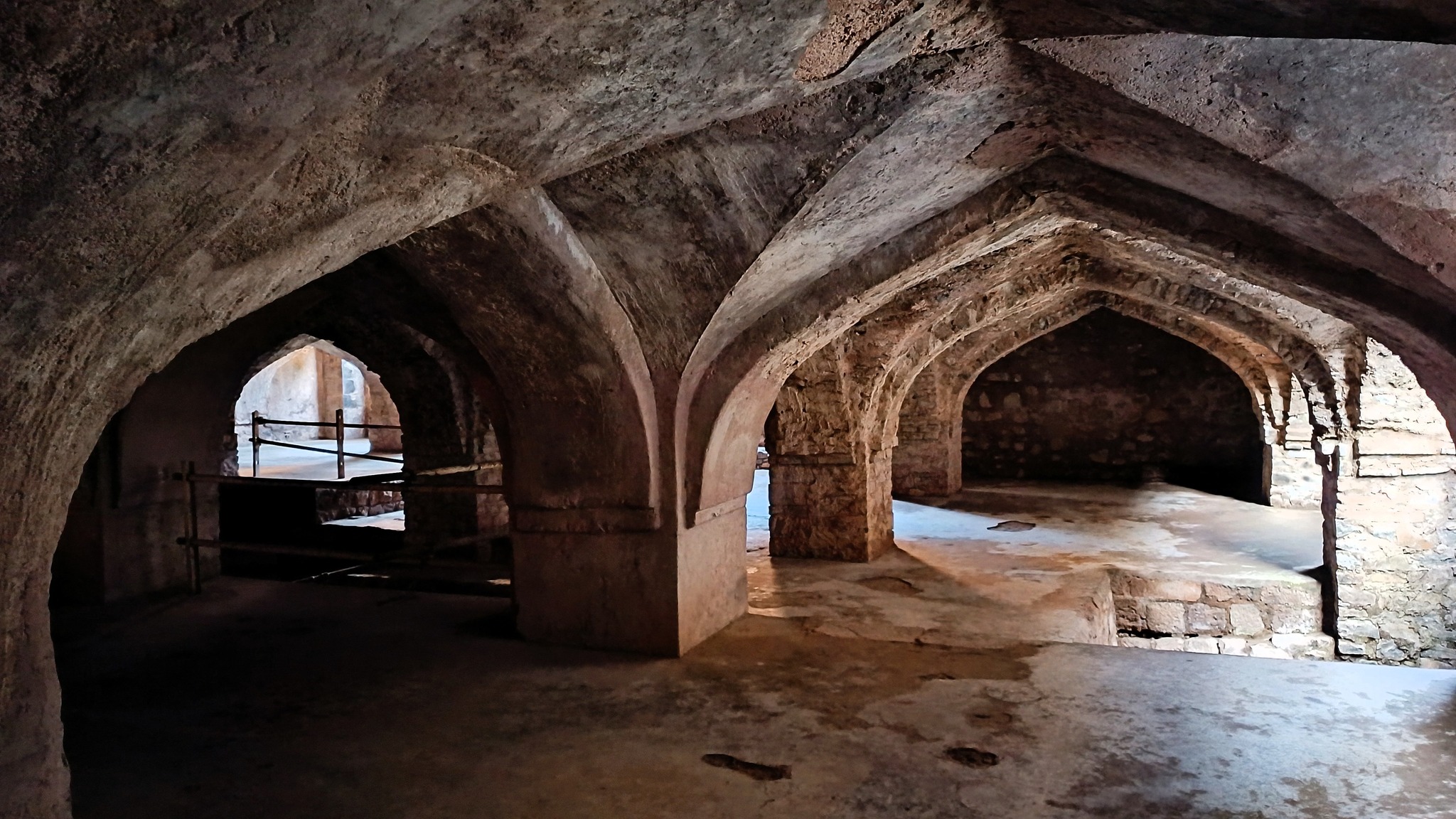 In the vicinity is the Hindola Mahal, a meeting hall structure resembling a swing, due to its sloping sides. Alongside it are other structures, forming part of the royal complex, such as the Champa Baodi, a well that once held water smelling of champak flowers, sitting beneath and accessed through a mesh of subterranean passages, and the Hammam, the Turkish-style royal bath, adjacent to the well. Gardens, and other structures such as the Jal Mahal on the Munja Talao behind Jahaz Mahal, and the Taveli Mahal on the Kapur Talao in front of Jahaz Mahal, complement the splendour of the royal complex.