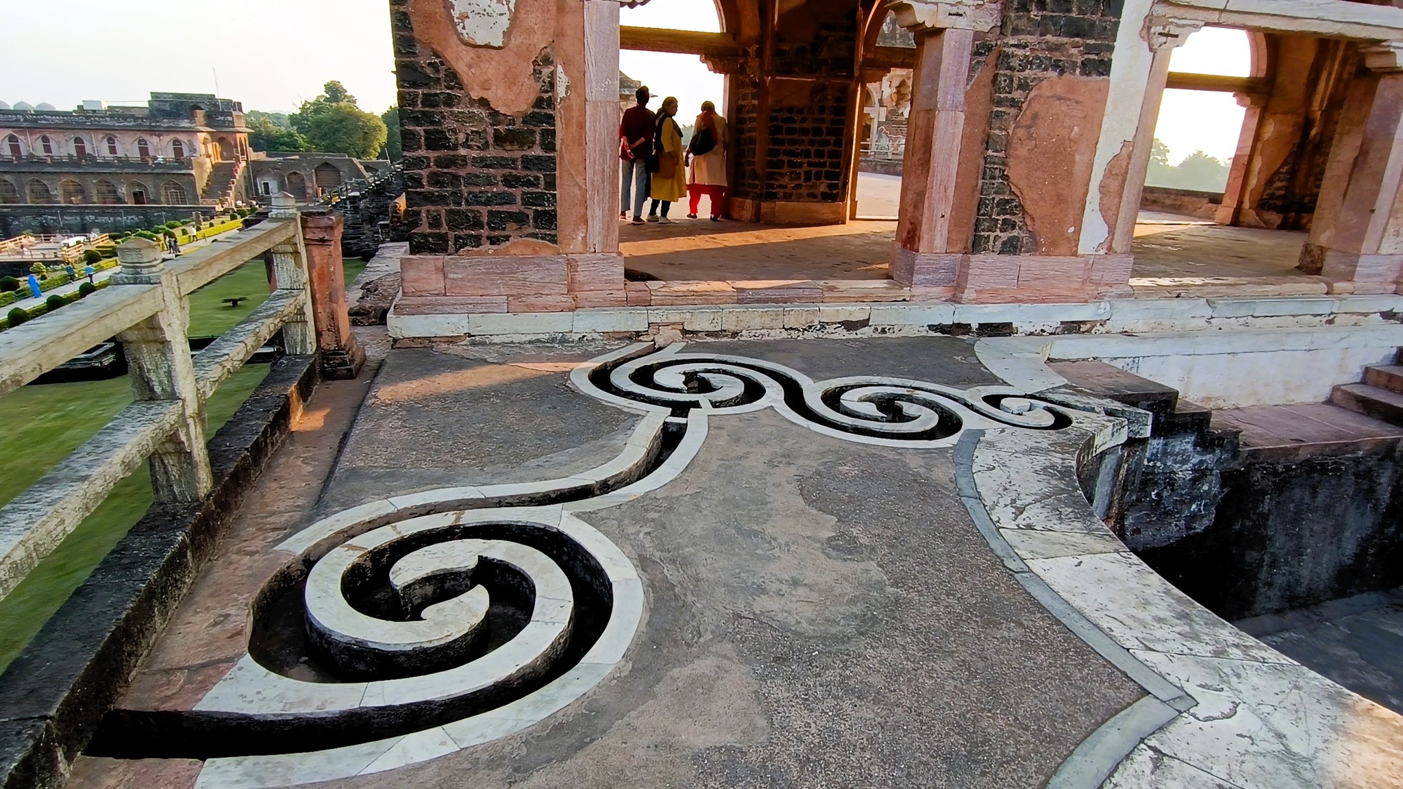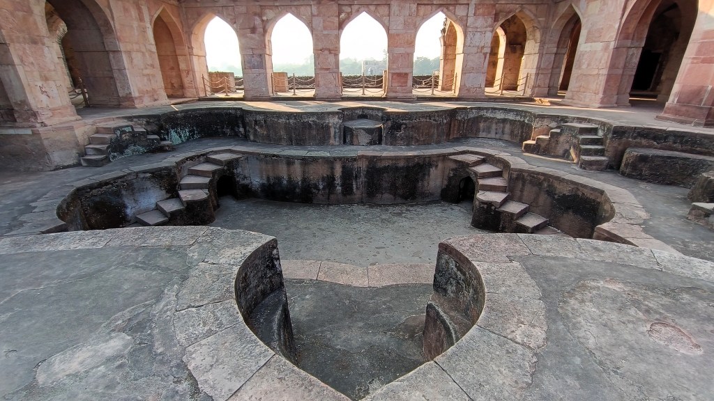 By 3 PM, we were finally inside Mandu’s fort walls, woefully late, only to learn that access or at least the visiting hours would be limited due to a G20 event involving foreign dignitaries! At break-neck speed, we made a tour of the Jahaz Mahal, where we were told we had only about an hour, before access was stopped to the public to cater to the dignitaries. Jahaz Mahal was built as a harem by Ghiyas-ud-din Khalji, a patron of the arts, to resemble a ship afloat the artificial water bodies surrounding it. A two-storeyed structure, it also features a small pool with flower-shaped outline on each storey.