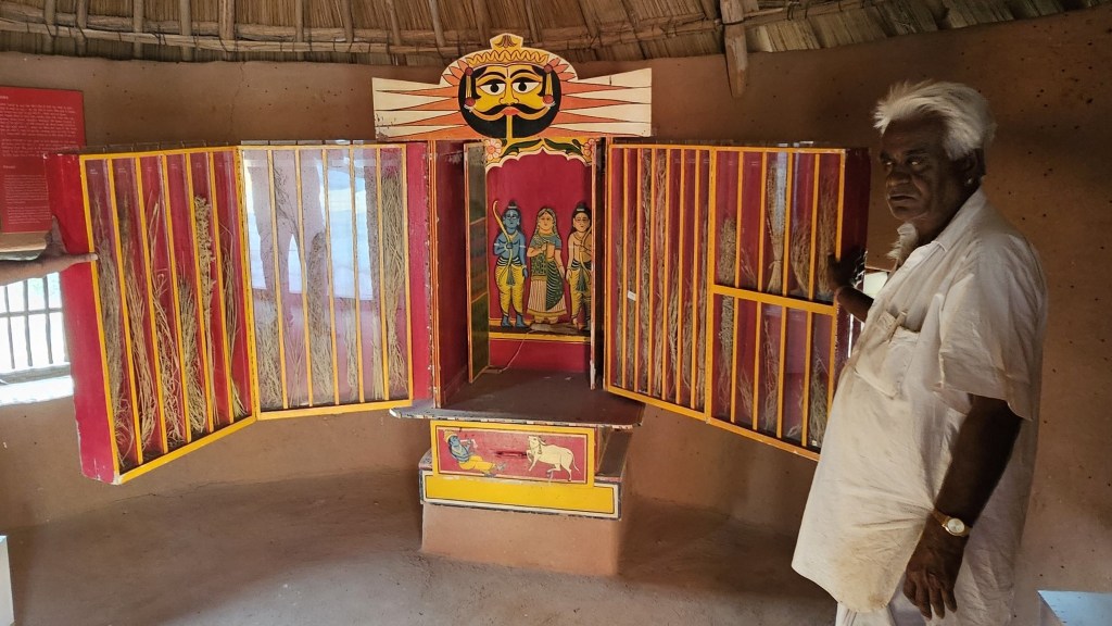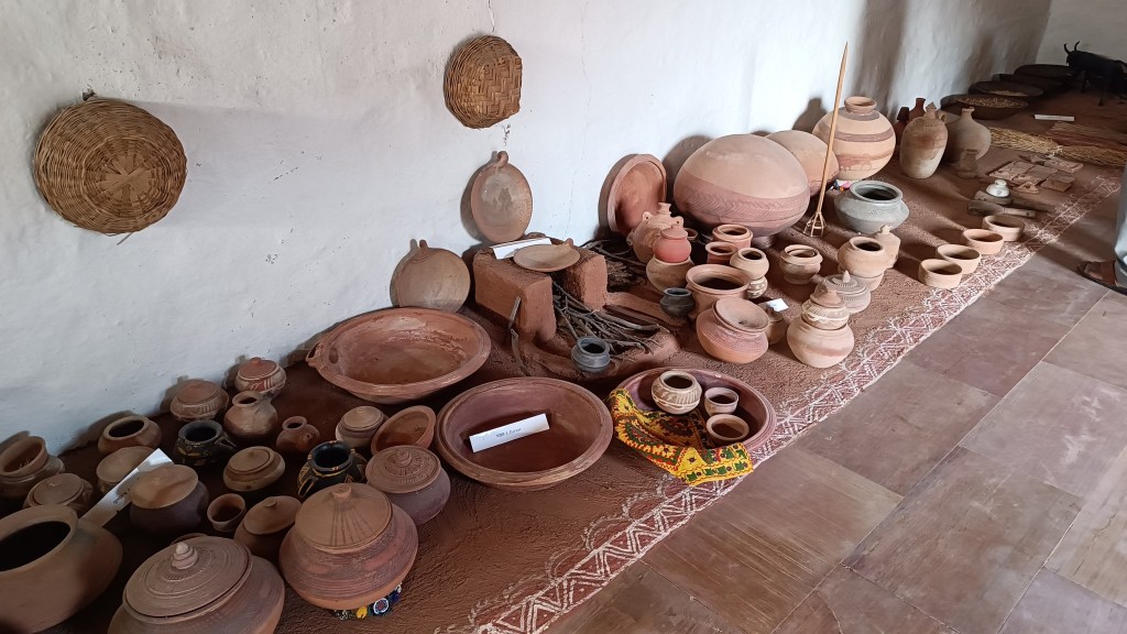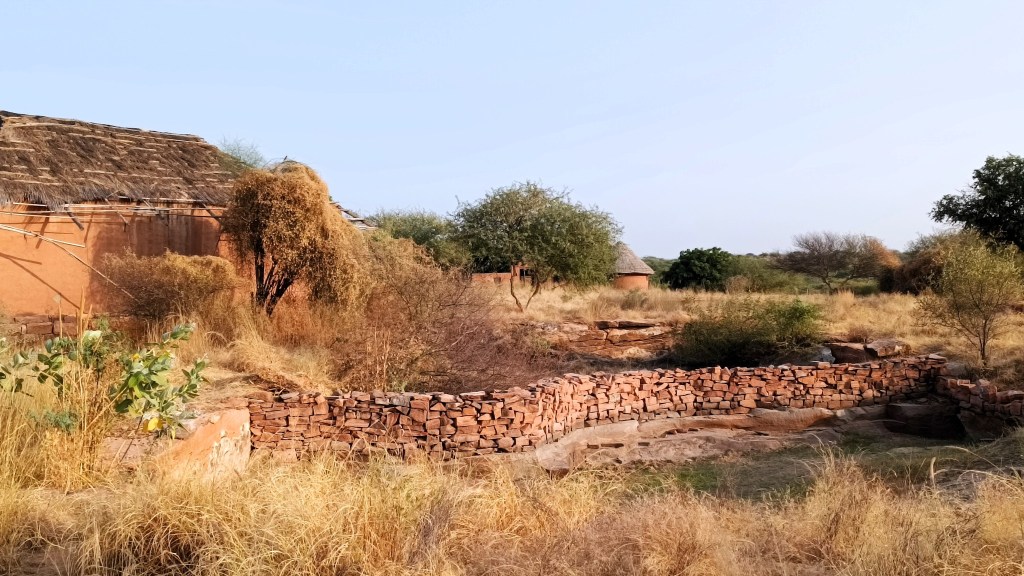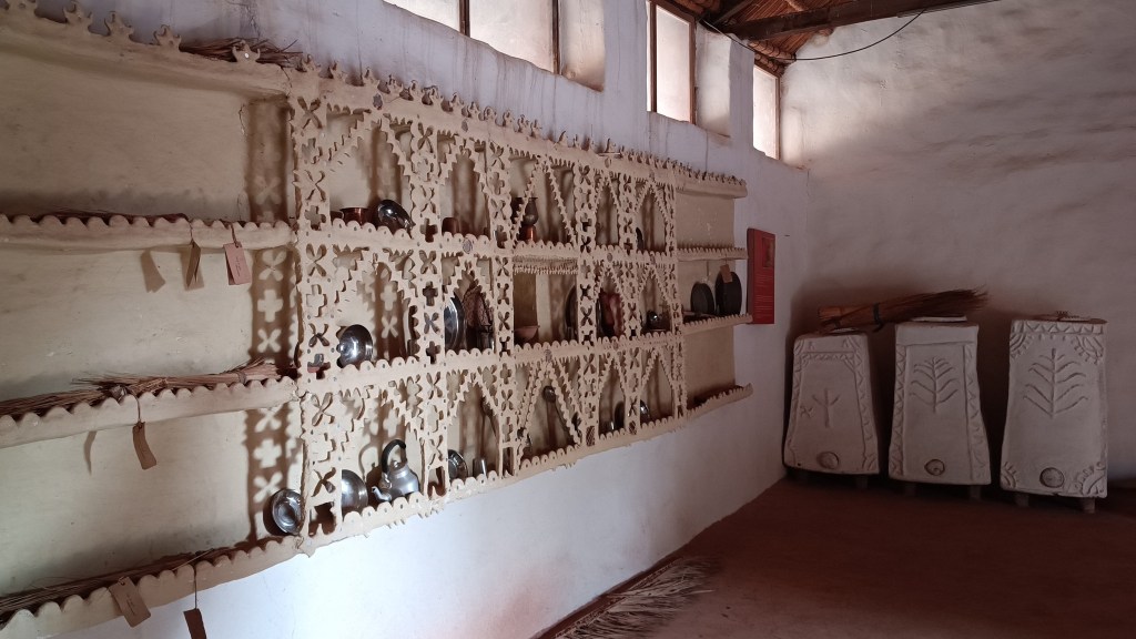 Walk towards the rear of the cluster of huts through the tall grass, and you reach the edge of a ravine with a stream that turns into a waterfall when it rains. The set-up of the huts in a cluster in a vastly open space reflects the general pattern of how habitation exists in and around the desert. The museum is highly recommended if one is keen for a glimpse into daily life in the desert, and into how daily life practices and processes have evolved within the ecological constraints of the desert.