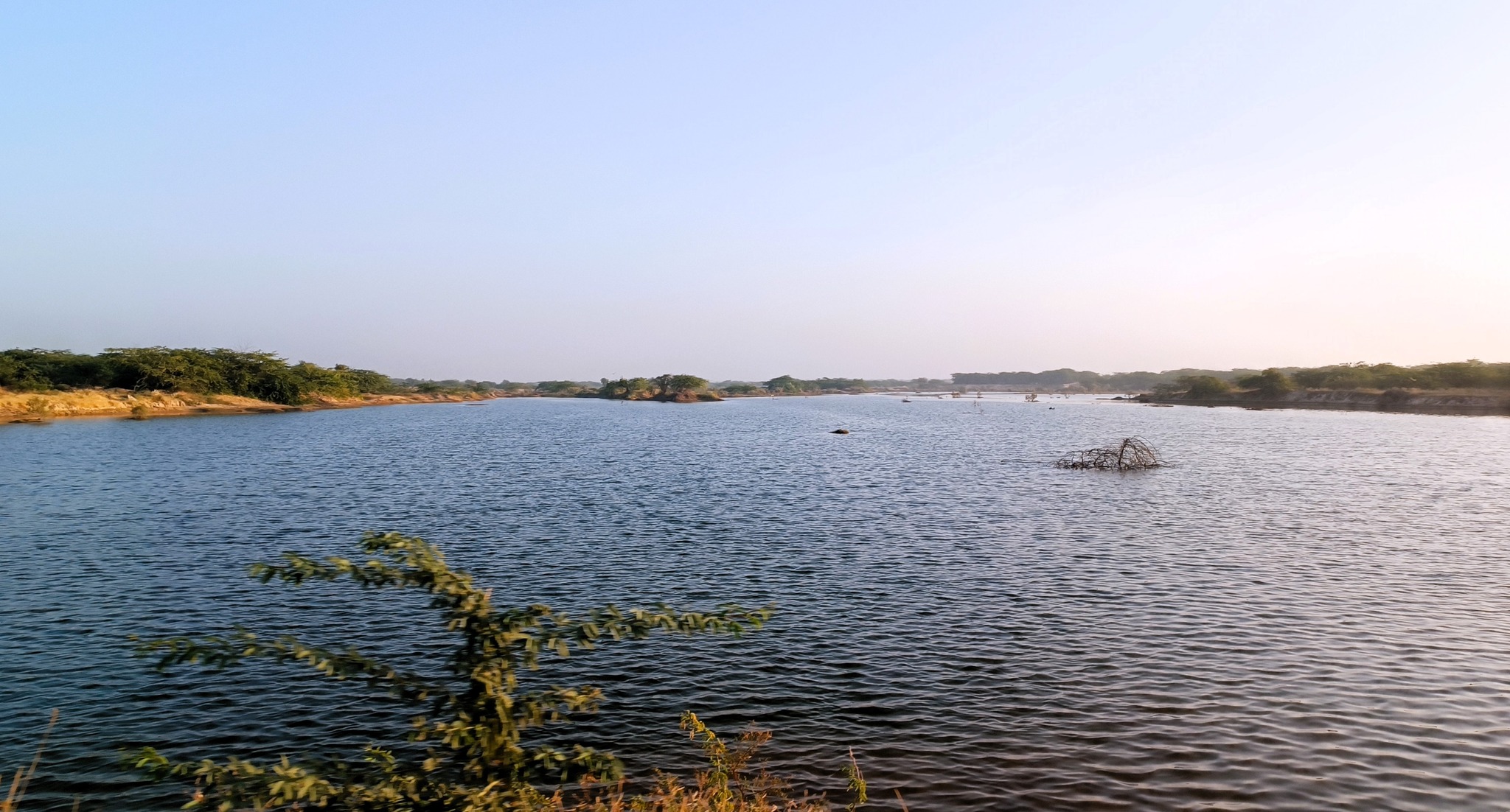 The blackbuck is even more sacred to the Bishnoi community, as Guru Jambheswar is purported to be reborn as a blackbuck. No wonder then that our safari included a stop at a memorial built by the Bishnois for the slain blackbuck. Then crossing the saline Luni river, the largest river of the Thar, and the only one that originates at Pushkar and ends in the Rann of Kachchh, we ventured into blackbuck territory. And lo and behold, in open spaces hidden behind curtains of bushes, we sighted a group of nearly 50.