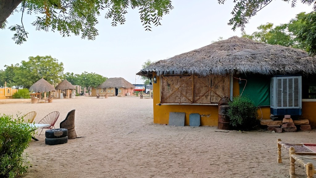 Crossing Rapar, a major town in Kachch, we then swerved left with the vegetation turning green, yet still sparse, reminiscent of the Thar. At around 1 PM, the land suddenly turned white, under a shroud of salt stretching for miles on end, only punctuated by a low hill in the distance and the tar road we were on cutting across the white expanse in a straight line – we had now entered the Rann of Kachch Lake. Crossing the stretch of white land, we were soon upon the Khadir Bet Island, where the desert vegetation was back on display. By 2 PM, we were at the Rann Resort Dholavira, our stay for the night, located right at the coast on the opposite side of the island.