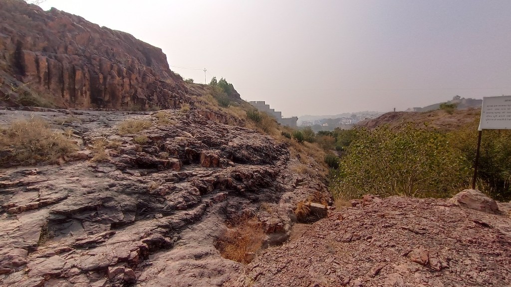 In fact, I had often wondered what lay behind the rocky outcrop holding up the Mehrangarh fort, and it turned out, it was this very park, the Rao Jodha Desert Rock Park. On our 2019 Jodhpur trip, we had even driven past the park on our way to Jaisalmer, but I had little idea back then that it was anything remarkable. Not until I learnt that the area in and around Mehrangarh fort was the site of not one, but two Geological Monuments of India – Jodhpur Group–Malani Igneous Suite Contact and Welded Tuff.