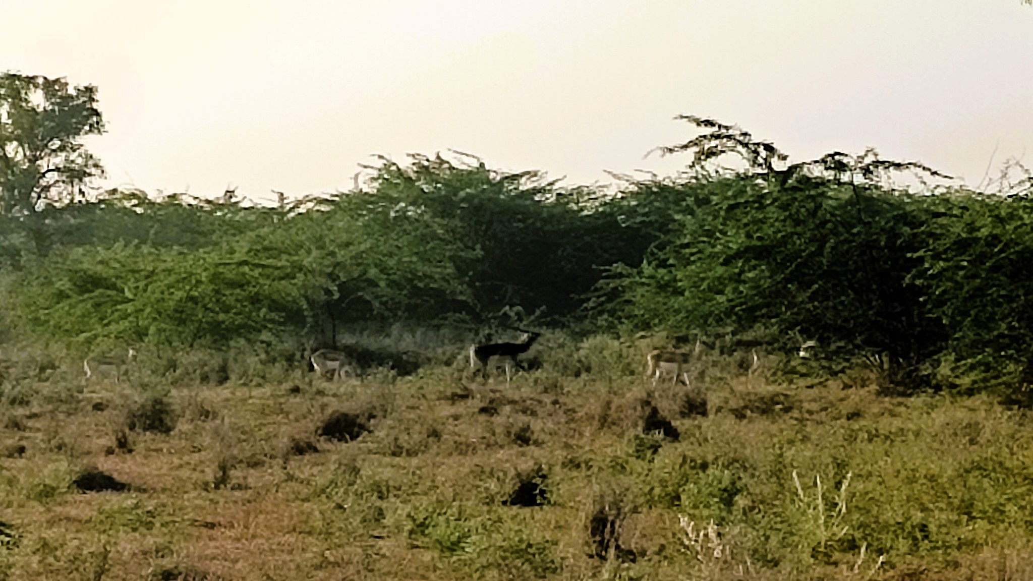 However, as I learned, sighting blackbucks is not the challenge –  it is just that the male blackbuck, which the layman has an image of in the form of a black upper body and white underbody, with long antlers, is rarer than the female blackbucks which have a brown upper body. Male blackbucks engage in lekking, whereby a single male takes control of a territory comprising multiple females and juveniles, driving away other males through aggressive means. It was interesting, however, to see two to three groups of blackbucks, led by their respective leading male blackbuck, mingling, while two male blackbucks at separate locations trudged through the forest, alone, in the distance.