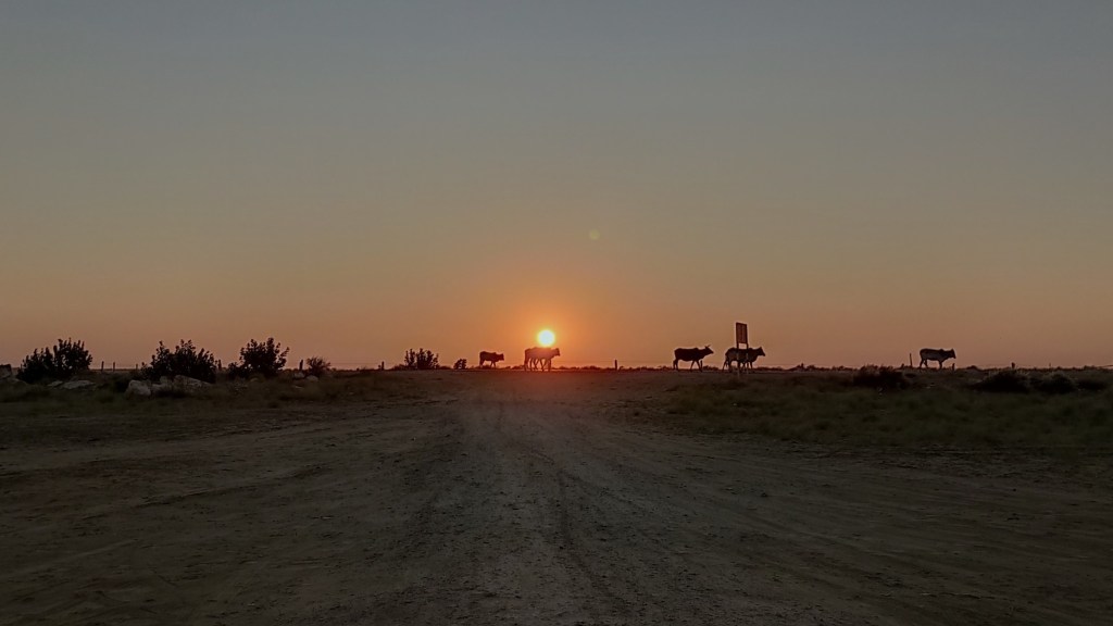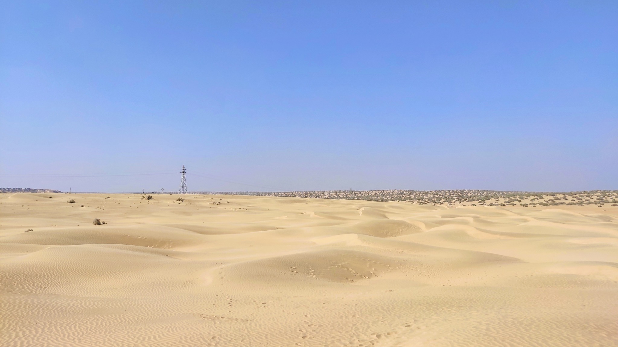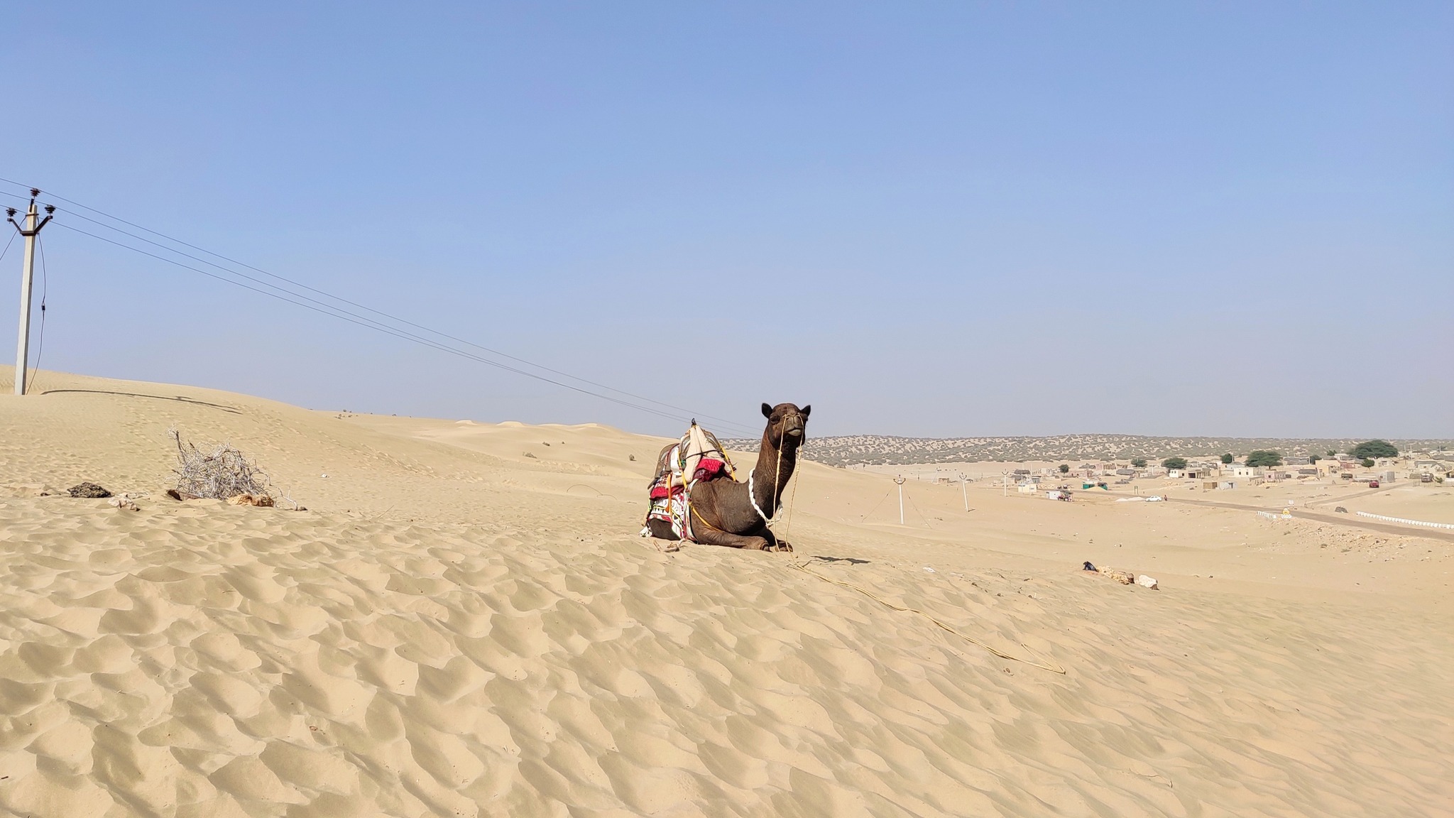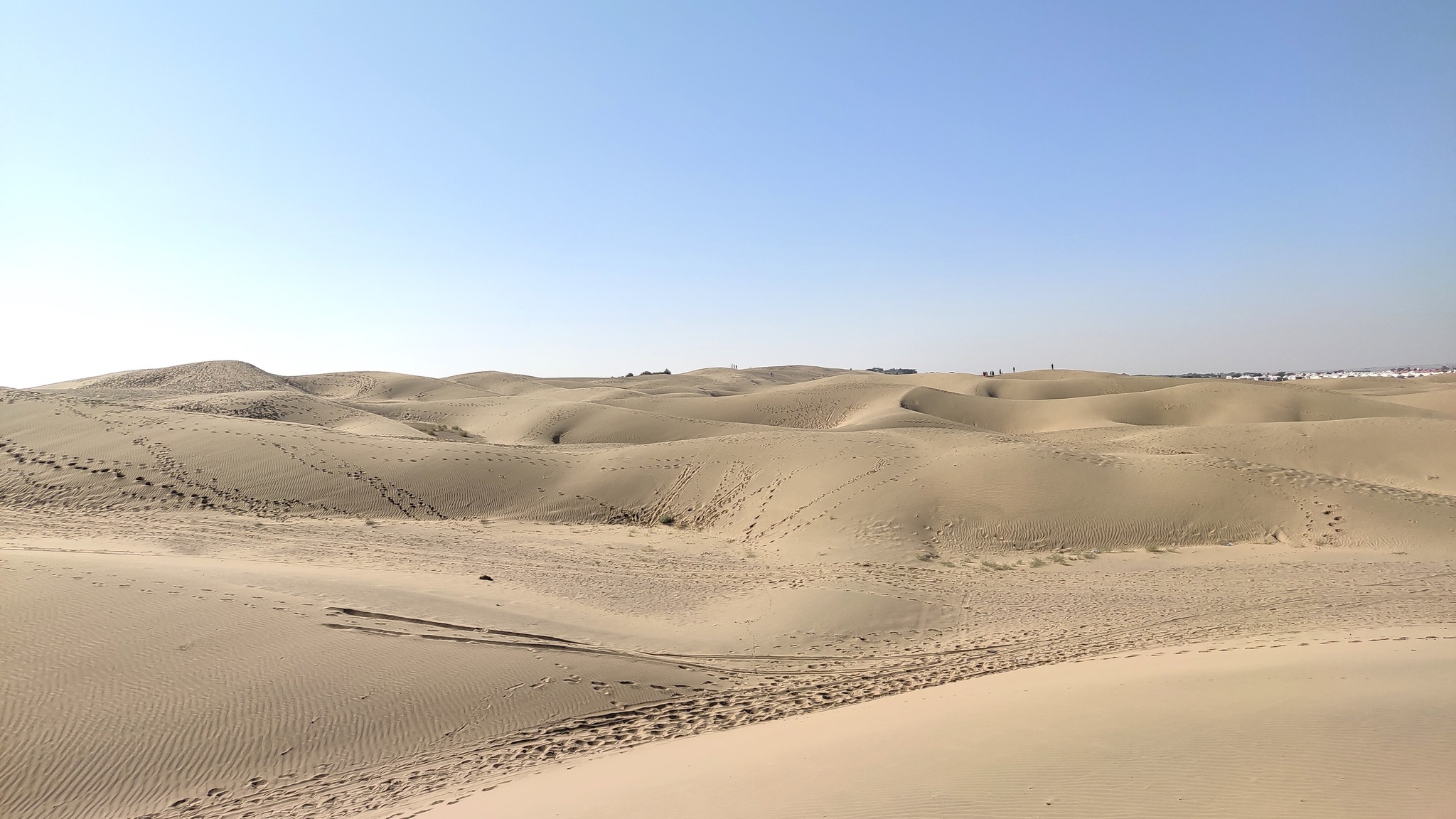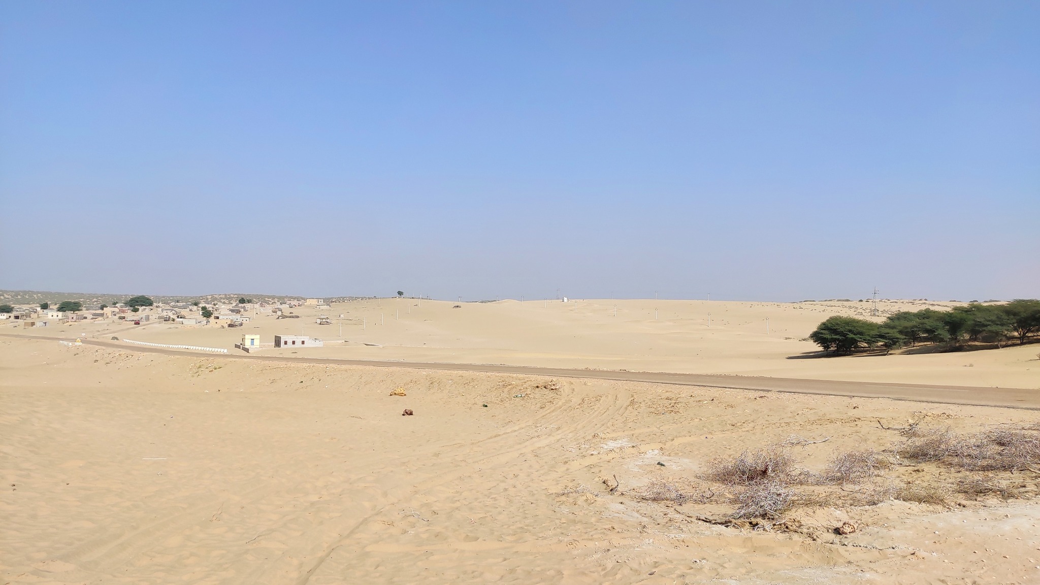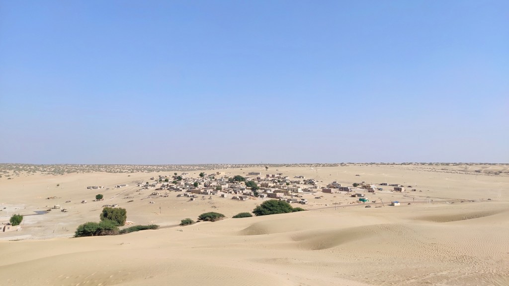 About an hour-and-half of driving deep into the desert, passing by expanses of sand dunes with smatterings of grass and shrub, we came upon a steep decline – ahead of us was a depression in the ground, stretching from one end to the other. It looked like the dried bed of a river – only the surface of the bed still looked indistinguishable from the higher ground all around – even as the road winded down the depression and rose again on the other side. There was no trace of vegetation, with only a handful of huts strewn around being the only habitation for as far as we could see of the other side of the ‘river bed’.