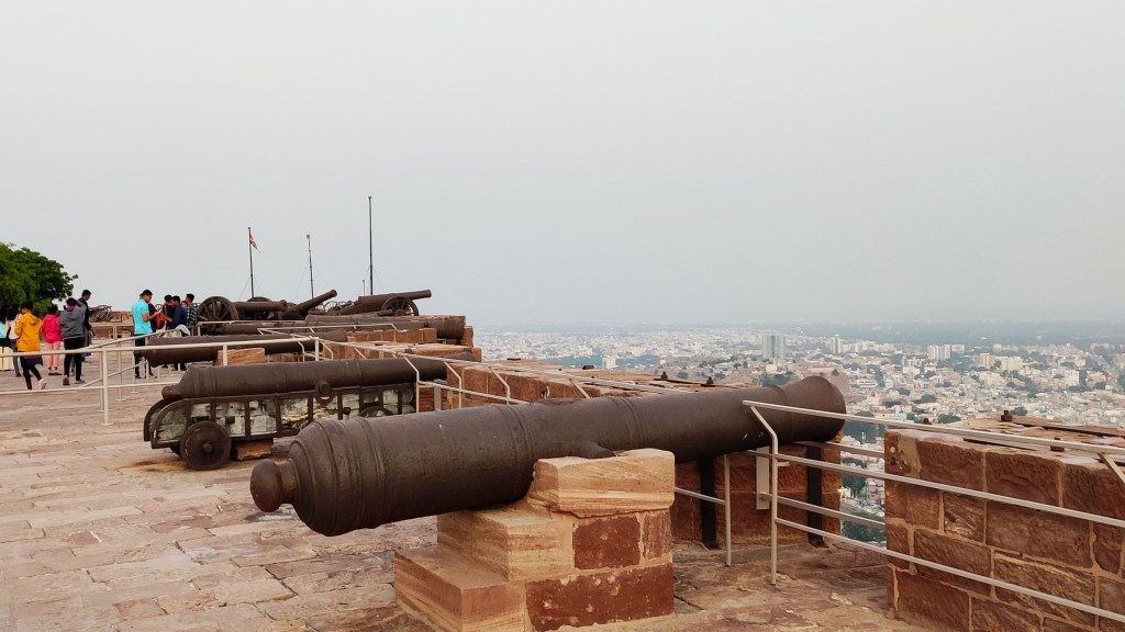 The Jaswant Thada itself is located on the top of a flat red-coloured rocky hill which is barren, only punctuated with water pools, and has the scenic backdrop of the Mehrangarh fort on one side. Next up was Mehrangarh fort, which we reached at 4.30 PM just in time before the gates closed for entry. Taking up a guided tour, we gawked at the imposing palaces and exquisitely done interiors, before ending the tour at the raised long platform lining the fort wall the end of the fort where the cannons stand. We were then back in the hotel to have dinner, and prepare for checking out next day to proceed to the next leg of our trip.