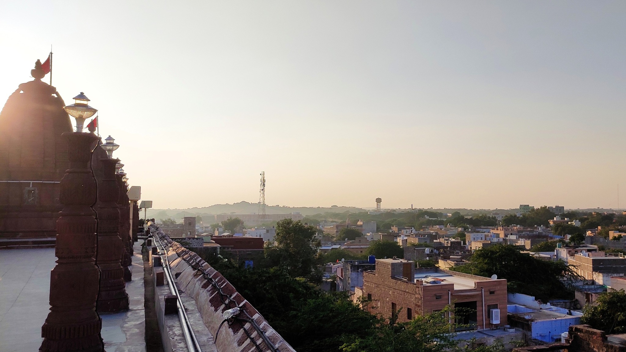 Later, we walked through the streets outside the palace, passing by and entering the street on the left side of the Lakshminathji temple. Just 100 metres in, we came upon the Baa ri Haveli, which we entered out of curiosity and were treated to interesting tidbits of the Rajasthani culture by way of of the artifacts on display, such as sculptures, furniture, toys, handicrafts etc. As we reached the terrace of the haveli, we saw the sun setting in the horizon marked by a long sandy ridge running in the distance outside the city limit, while twin spires of two temples stood in the foreground right in front of us.