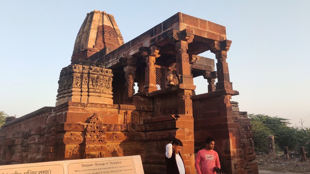 By 12, we were back again on the road headed back to Jodhpur, through a different route than the one we took for the outward leg from Jodhpur. Around 2.30 PM, we stopped at Phalodi to have lunch, and by 4.30 PM, we were at Osian. Osian, dubbed an oasis in the Thar, was a major religious centre of the Gurjara-Pratihara period dating from the 5th to 12th century AD, and had been a trading centre from well before that, at least from the Gupta period onwards. Today, the ruins of Jain and Hindu temples from that period stand witness to its glorious past. The Oswal community is said to have originated from Osian.