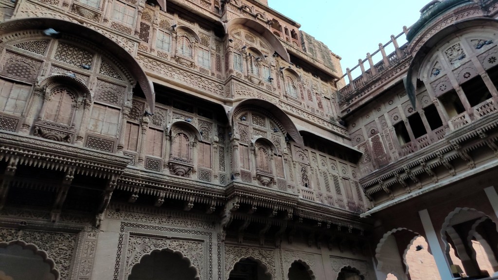 Patwon ki Haveli was constructed over 50 years, starting in 1805 AD commissioned by Guman Chand Patwa, a trader of jewelry and fine brocade. The haveli is typified by latticed balconies carved out of sandstone but seeming as if carved from wood, ornate wall paintings, exquisitely carved pillars, and extensive corridors and chambers. After seeing the haveli, we proceeded to Jaisalmer Fort. At Jaisalmer fort too, we took a guided tour through the main palaces, hearing stories of the past, getting transported to the times when these were inhabited by the royals.
