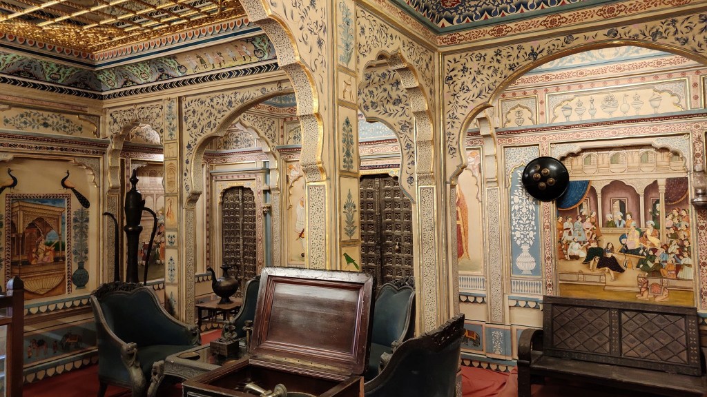 Walking through the various palaces, halls, hallways, corridors, flights of steps, terraces – every succeeding ruler progressively adding more structures and accommodations – we finally came upon a large section, which held in display a DH-9 De Havilland single-engine biplane that saw action in the First World War. This was installed by piecing together the parts from one of two such warplanes shot down in the First World War, which were gifted to Bikaner state in recognition of the 500-strong camel cavalry support provided by Maharaja Ganga Singh to the British Government in the war then-dubbed as the Imperial War.